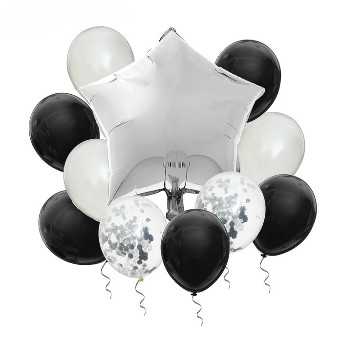 Фольгированный серебряный шар "Звезда", 2 прозрачных шара, 3 серебряных, 5 черных шаров, конфети и ленты для шаров