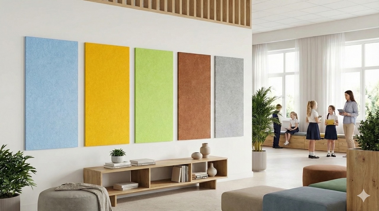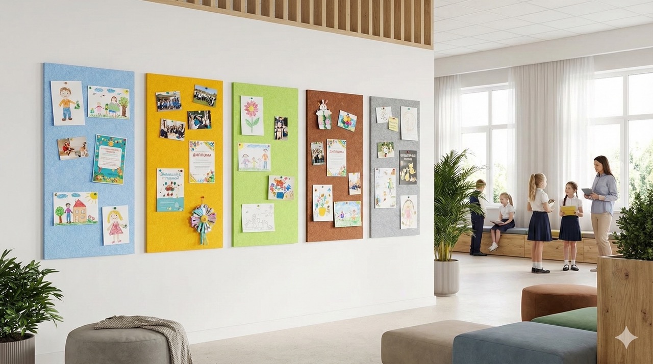 Компания "Интердизайн" представляет инновационное решение для школ и детских садов - стенды и мозаичные решения из эко-войлока. Дизайнерские решения из эко-войлока сделаны из экологичного шумоизоляционного материала. Это очень важно для создания комфортной среды в учебных учреждениях. Современная альтернатива пробковым и текстильным доскам. Эко-войлок можно использовать как базу для размещения тематической информации, фотографий, рисунков и декоративных решений при помощи обычных канцелярских кнопок. Многофункциональное покрытие: -* защита от холодных стен -* звукоизоляция -* основа для крепления любой полезной информации Данная композиция - отличное решение для создания галереи детских творческих работ. Специалисты нашей дизайн-студии создадут любое интерьерное решение из эко-войлока для Вашего учебного учреждения, детского центра или детской комнаты.