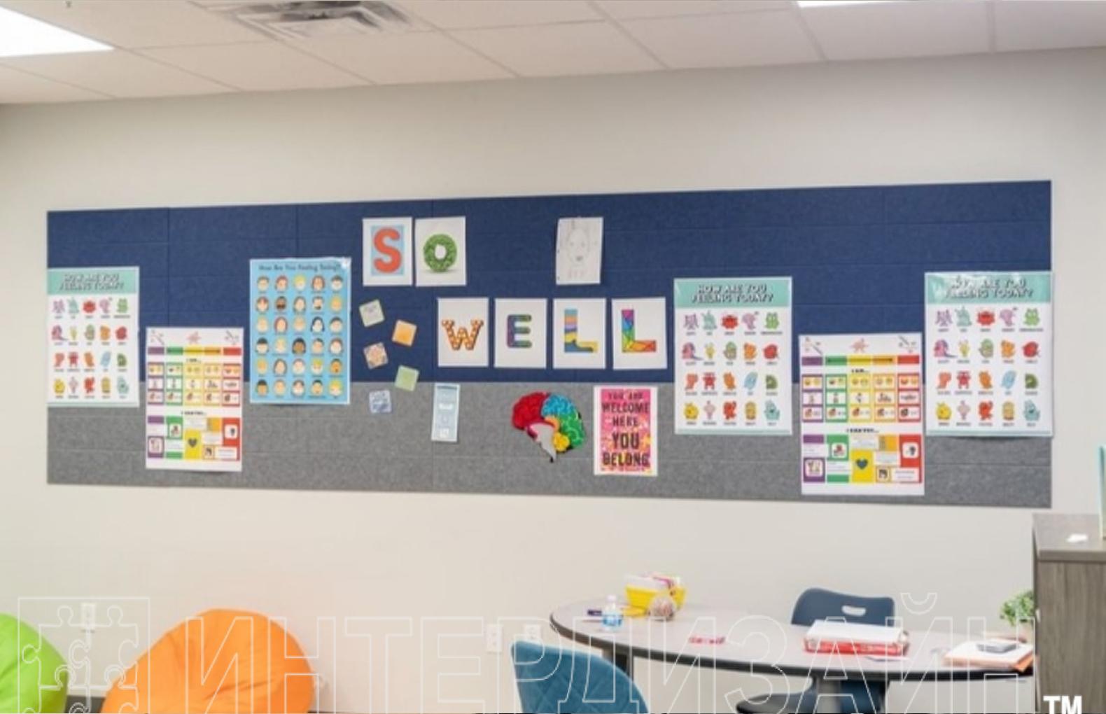 Дизайнерские решения из эко-войлока сделаны из экологичного шумоизоляционного материала. Это очень важно для создания комфортной среды в учебных учреждениях.