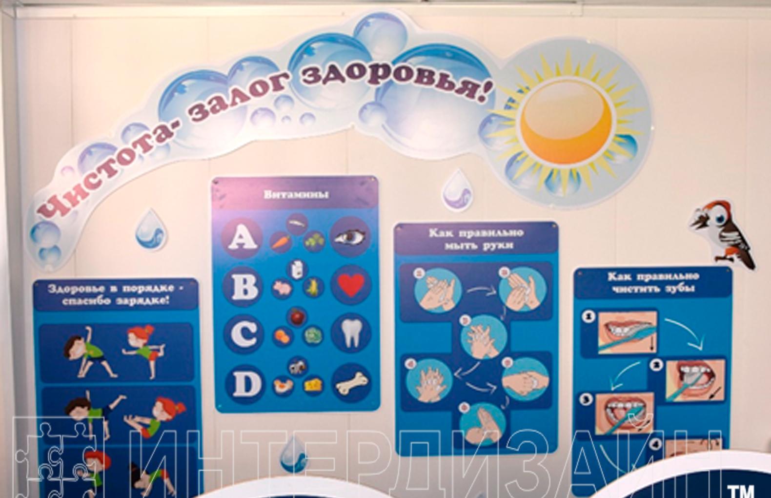 В комплекте:Стенд "Зарядка", Стенд "Витамины", Стенд "Как правильно мыть руки",Стенд "Как правильно чистить зубы"