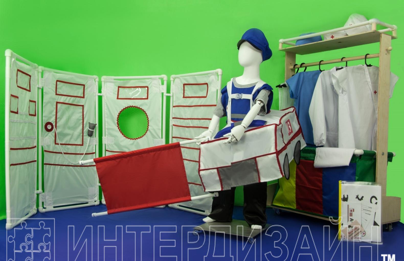 ►Костюмы: Доктор 2 шт, медсестра 2 шт., хирург 1 шт., водитель скорой помощи 1 шт. ►Ширма из труб диаметром 25 мм из 4-х секций. ►Комплект чехлов «Скорая помощь». ►Каркасный автомобиль «Скорая помощь». ►Аксессуары: носилки, белая простынка 77х77 см. ►Бумажная атрибутика: медицинская карта, рецепт, результаты рентгена, результаты УЗИ-диагностики, схема для проверки зрения, надписи к кабинетам, счастливчики (прототип денег) для покупки лекарств, права для водителя скорой помощи.