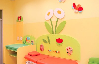 Ориентировочная комплектация: кушетка медицинская детская с декоративными элементами, пеленальный комод с декоративной панелью, шкаф для мед.препаратов с декорацией, комплект настенных оформительских элементов