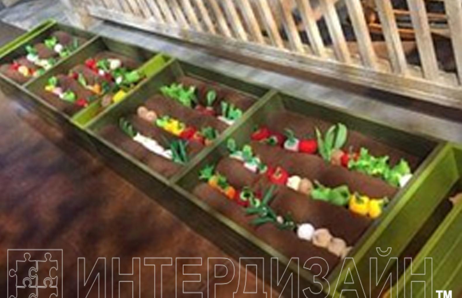 (ограждение – 2 секции, ящик с грядками, комплект декораций Овощи на подставках, комплект муляжей овощей для имитации грядки, фетр коричневый для имитации земли)