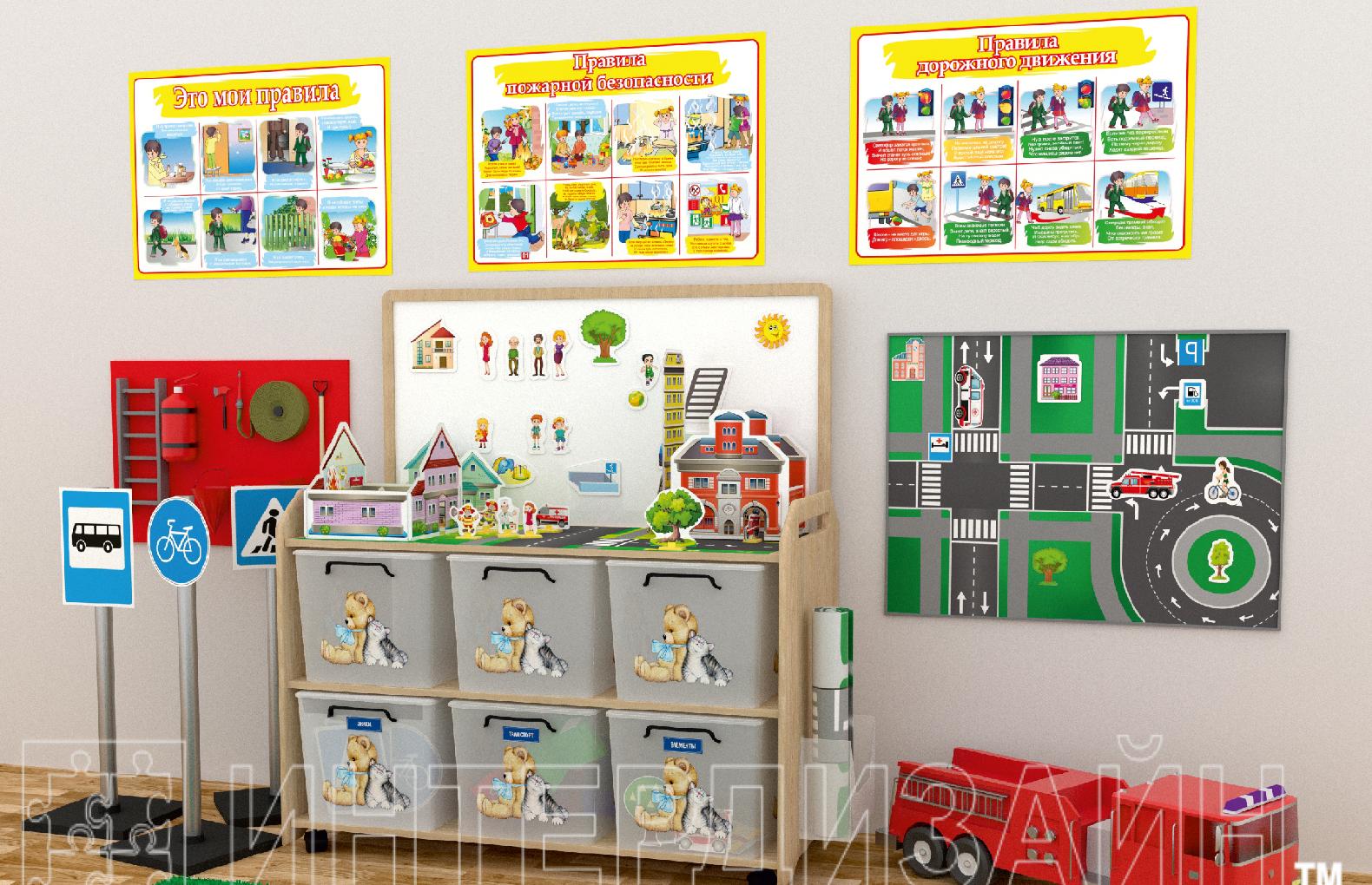 Предлагаемая классическая комплектация: комплект стендов «Правила безопасности», система хранения с магнитной доской, методическое наполнение – магнитная доска с комплектом магнитов «Дорожное движение», методическое пособие «Юный пожарный», авторские магниты «Правильное поведение», игровой модуль МЧС, пожарный щит, набор МЧС (жилет, лом, топор, каска, огнетушитель, рация) – 2 шт., комплект костюмов Участники дорожного движения