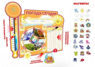 Некоторые модели магнитно-маркерных календарей природы продаются с любимыми детскими магнитиками. На них изображена одежда, которую необходимо одевать при той или иной погоде, государственные праздники, природные явления. Каждому ребенку такой элемент однозначно придется по душе. Ведь кто не любит магниты!
