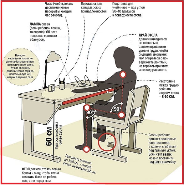 Не последнюю роль в этом играет место для обучения. Рабочий уголок должен состоять из удобных стола и стула, которые отвечают возрастным особенностям ребенка и изготовлены из качественных материалов. Кроме того нужна настольная лампа, ящики и полочки для хранения книг, тетрадей и других канцелярских принадлежностей. Желательно, чтобы ребенок, будучи еще дошкольником, получил опыт выполнения различных заданий, работы с дидактическими пособиями сидя за столом, тогда выполнение уроков будет восприниматься адекватно. Важно, чтобы на столе не было отвлекающих школьника предметов, уберите телефон, планшет, игрушки, выключите телевизор и радио, чтобы ребенок мог сосредоточиться на задании.