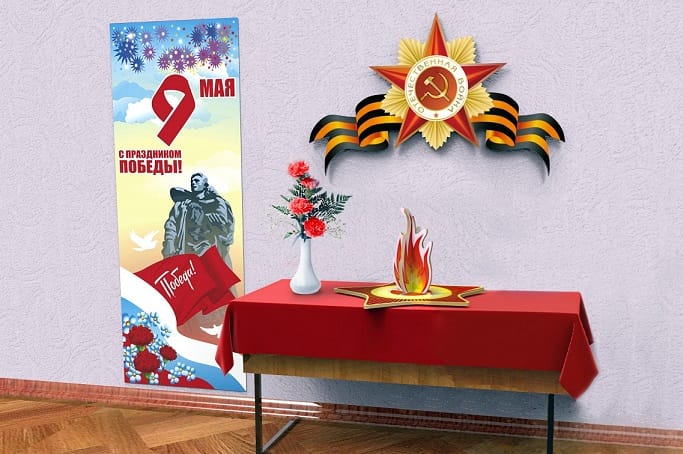9 мая – это особая дата. В детский сад приходят ветераны, для которых хочется создать праздничную атмосферу и приятно удивить. Стены можно украсить тематическими наклейками и элементами, на сцене разместить декоративный вечный огонь и повесить баннер-растяжку.