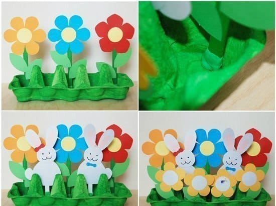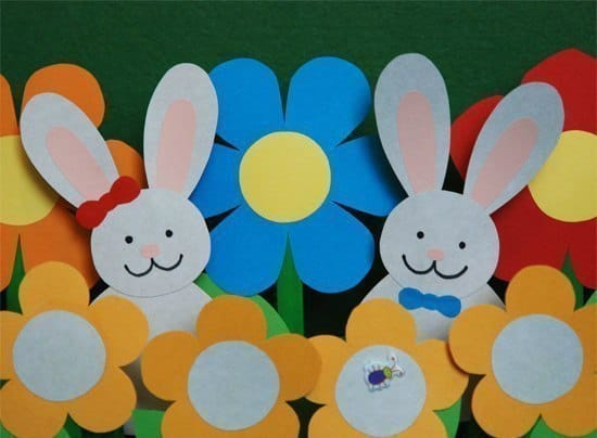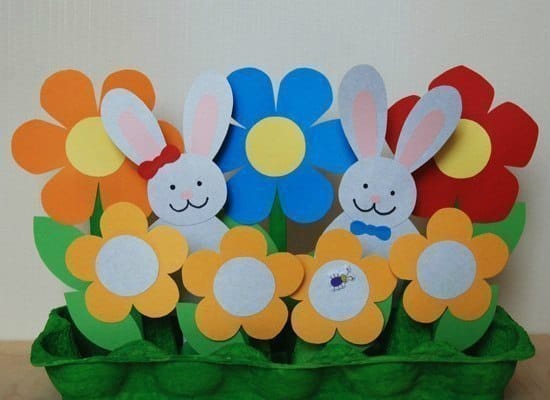 С нижней стороны палочки с зайчиками, крепим пластилин и ставим зайчиков между цветочками.
