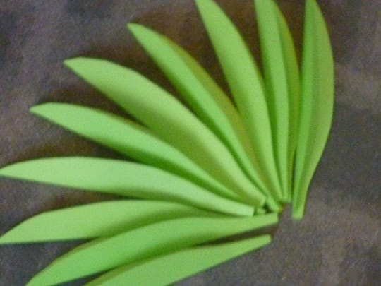 Из зеленой бумаги вырезаем листочки, оставляя у основания 1 см в ширину для приклеивания к стволу.