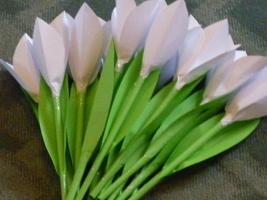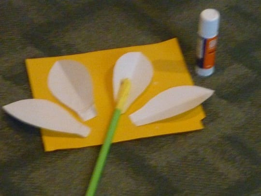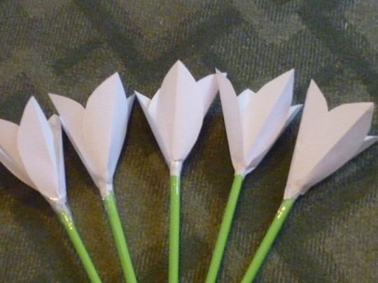 Из белой бумаги вырезаем лепестки, оставляя у основания 2-3 сантиметра в ширину. С помощью скотча лепестками покрываем сердцевину и крепим к стволу.