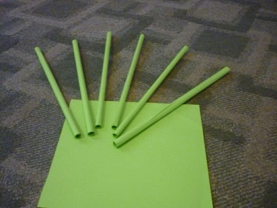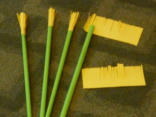 Из желтой бумаги вырезаем прямоугольник, из него режем "травку", не дорезая до конца. Затем "травку" приклеиваем к нашей трубочке.