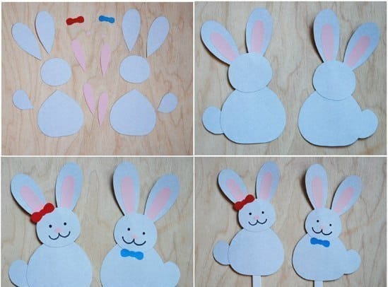 По шаблону вырезаем отдельные части для зайчика и склеиваем их между собой, после чего приклеиваем на палочку.