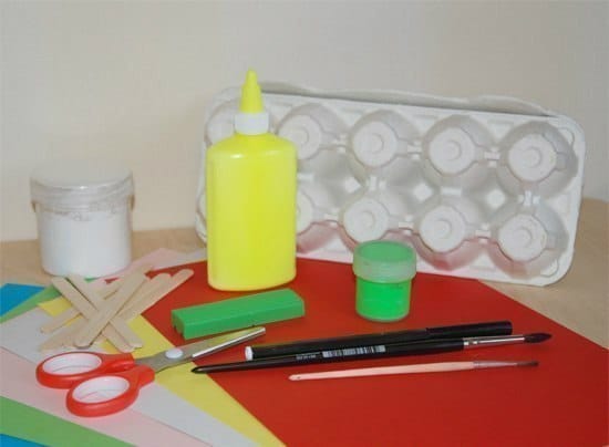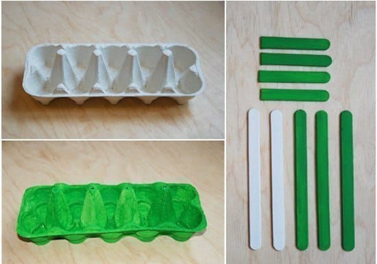 Палочки делаем разной длины, достаточно 2 видов. Зеленым цветом закрашиваем палочки для мороженого и лоток из-под яиц.