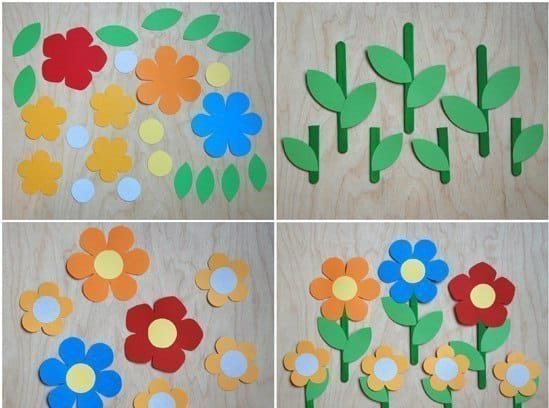 Из цветной бумаги вырезаем листочки, цветочки и приклеиваем их к палочкам.