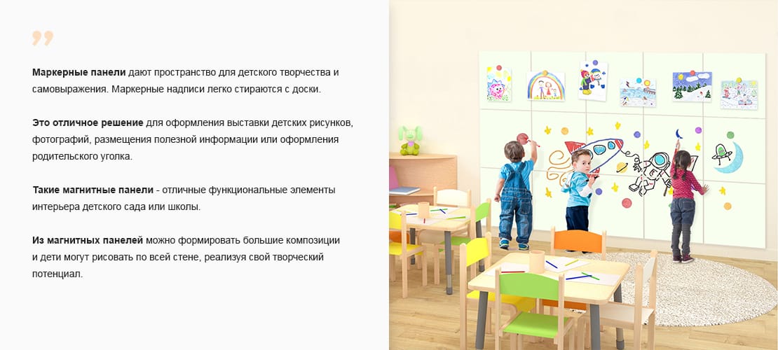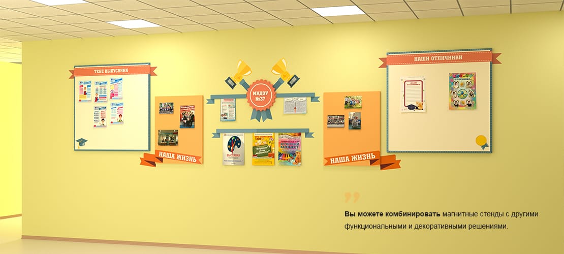Стены детского сада или школы имеют огромный потенциал для организации учебно-воспитательного процесса. И компания «Интердизайн» придумала отличный вариант, чтобы в полной мере использовать этот потенциал – магнитно-маркерные панели. Такие панели придают функциональность пространству, способствуют групповой работе, развивают творческое мышление. Теперь вы не привязаны к форматам карманов или рамкам. На магнитной доске вы можете как разместить большой плакат, так и множество небольших фотографий и рисунков.