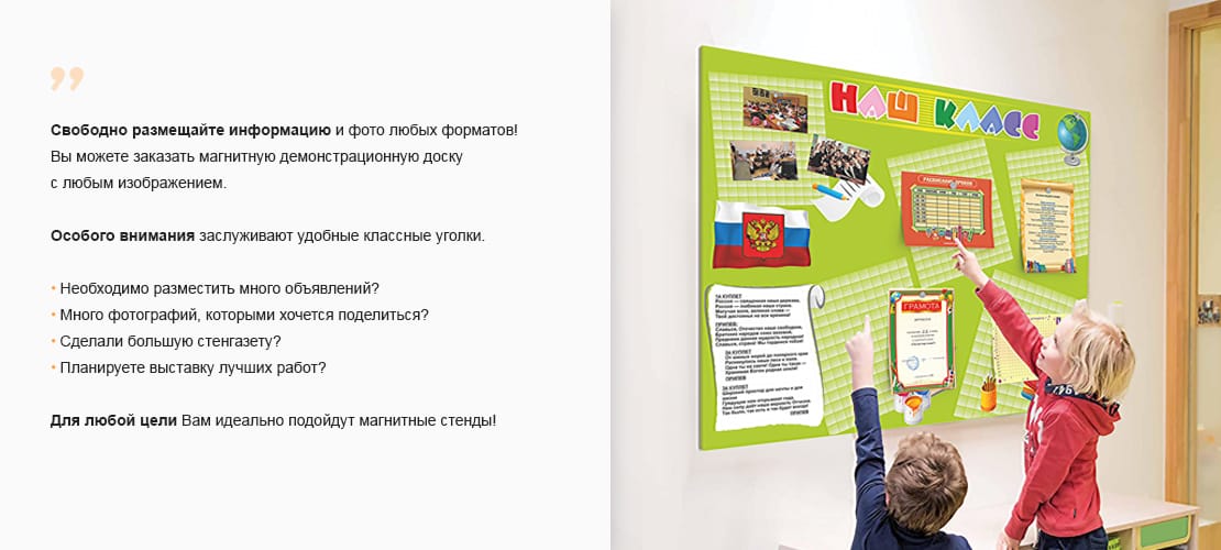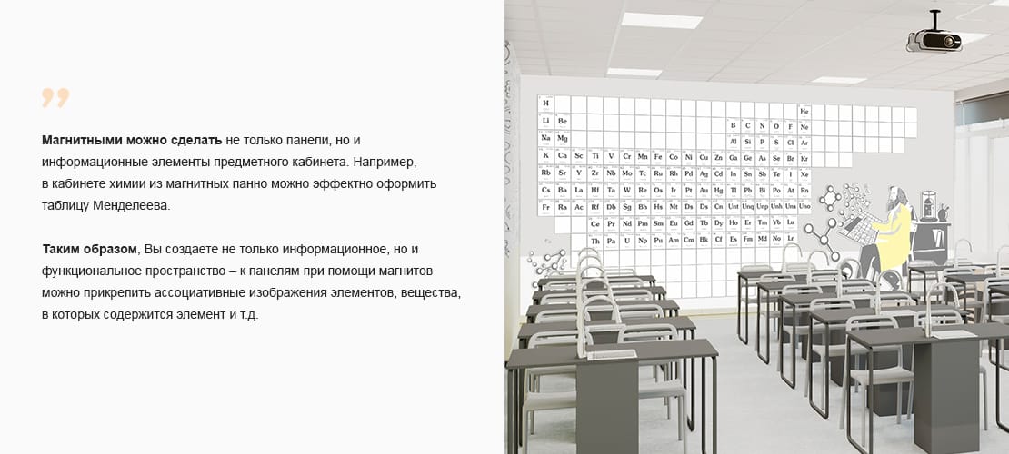 Такие панели совмещают в себе функционал стенда, магнитной доски, маркерной панели и методического пособия.