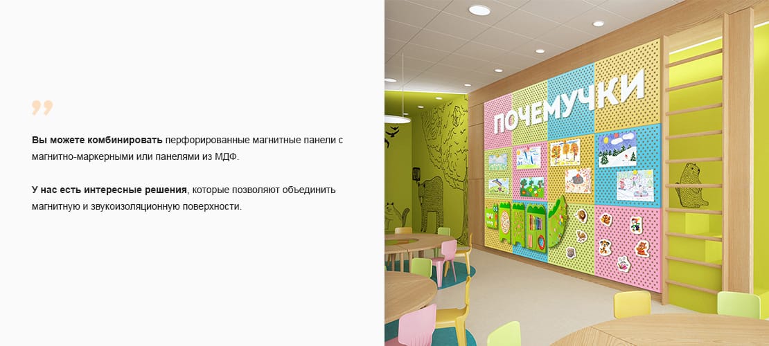 Также есть вариант магнитного оформления стены из перфорированного металла приятных цветов. Такая стена будет не только украшать интерьер, но и нести огромный функционал. Ведь на ней с легкостью можно размещать различные картины, стенды, выставку рисунков, крепить с помощью магнитов учебную информацию или объявления для родителей, или даже размещать на специальных крючках полочки, бизиборды или дидактические материалы.