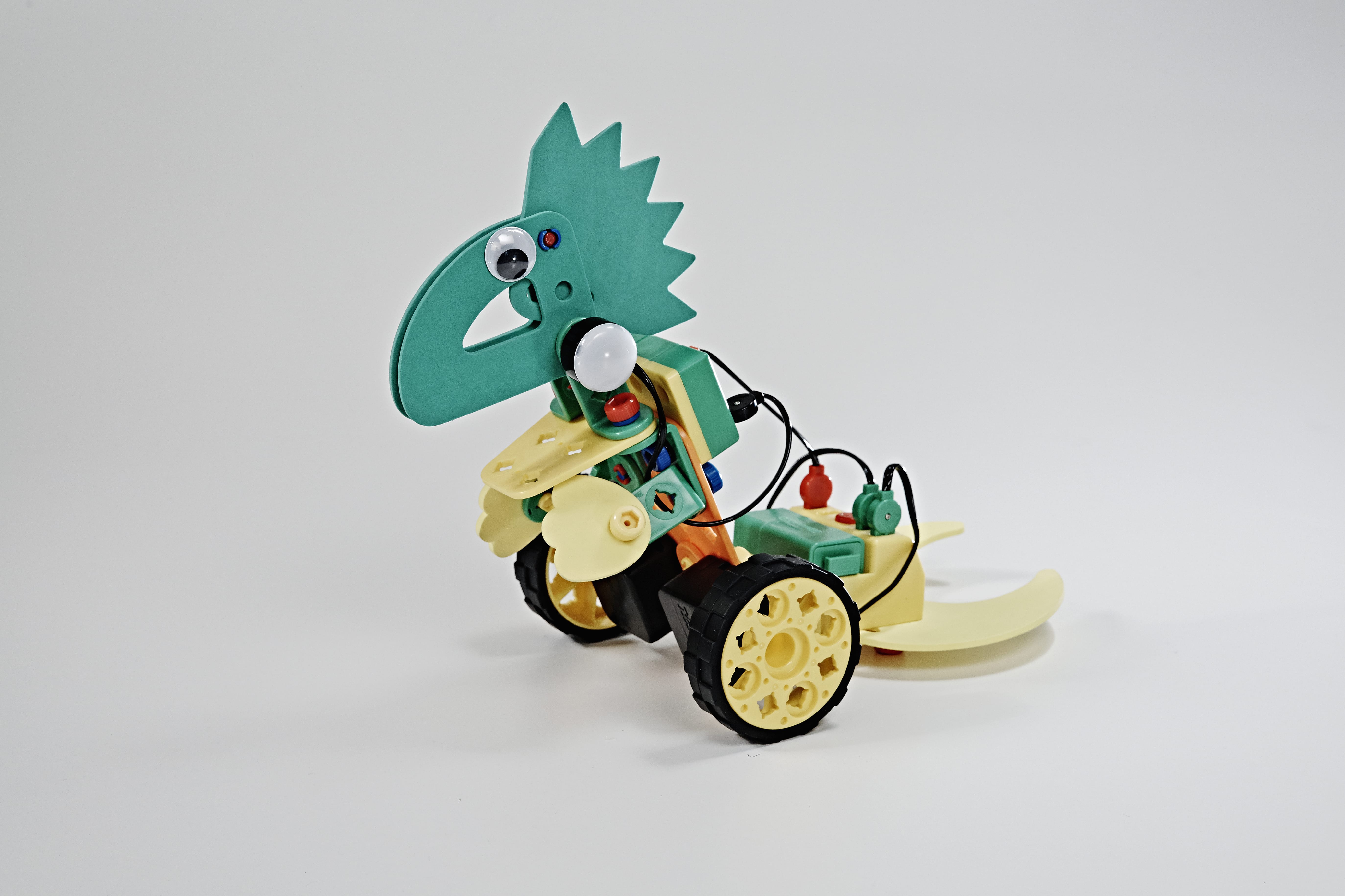 В состав комплекта входит 130 конструктивных элементов (не менее 5 различных цветов), которые позволяют собрать не менее 12 различных моделей (робот, качели, лягушка, бабочка, машина, кран, жираф):