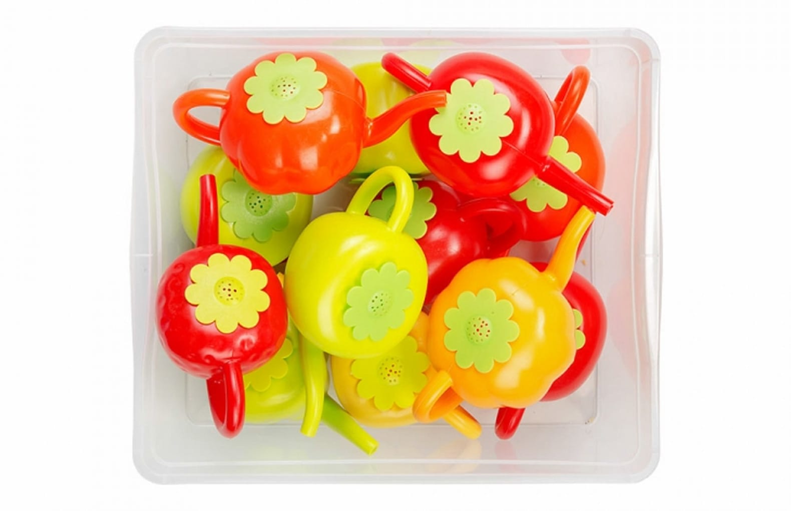 Большой комплект из 12 леек в форме овощей и фруктов подходит для активных прогулок и занятий в помещении с дошкольниками всех возрастов. Легкие игрушки оснащены удобным тонким носиком и крепкой ручкой, которые помогут ребенку быстро освоить навык работы с лейкой. Этот игровой материал возможно использовать в рамках трудового воспитания и приучения детей к выполнению бытовых задач, в игровой форме занятия будут интересны воспитанникам. Набор укомплектован большим пластиковым контейнером с крышкой, обеспечивающим надежное и компактное хранение габаритных игрушек.