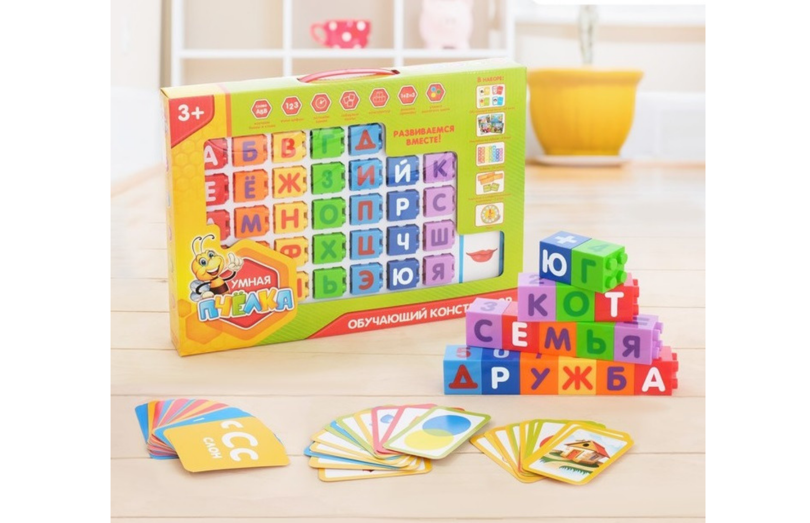 Конструктор обучающий «Алфавит», 60 обучающих карточек, 33 кубика, 4 вида наклеек, часики, 5 карточек с математическим заданием - Отзывы