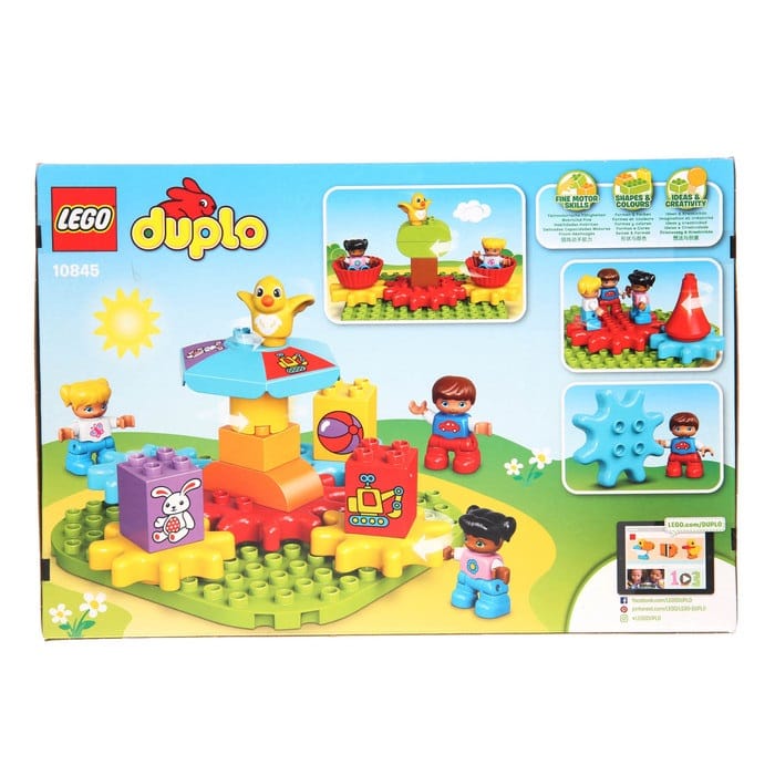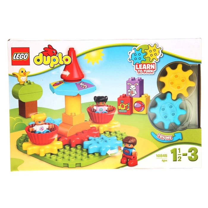 Объясните ребёнку работу простых механизмов вместе с Lego Duplo. Соберите с малышом карусель из цветных шестерёнок и покрутите красный шпиль аттракциона. Если конструкция построена правильно, то каждая кабинка закружится точно в танце.