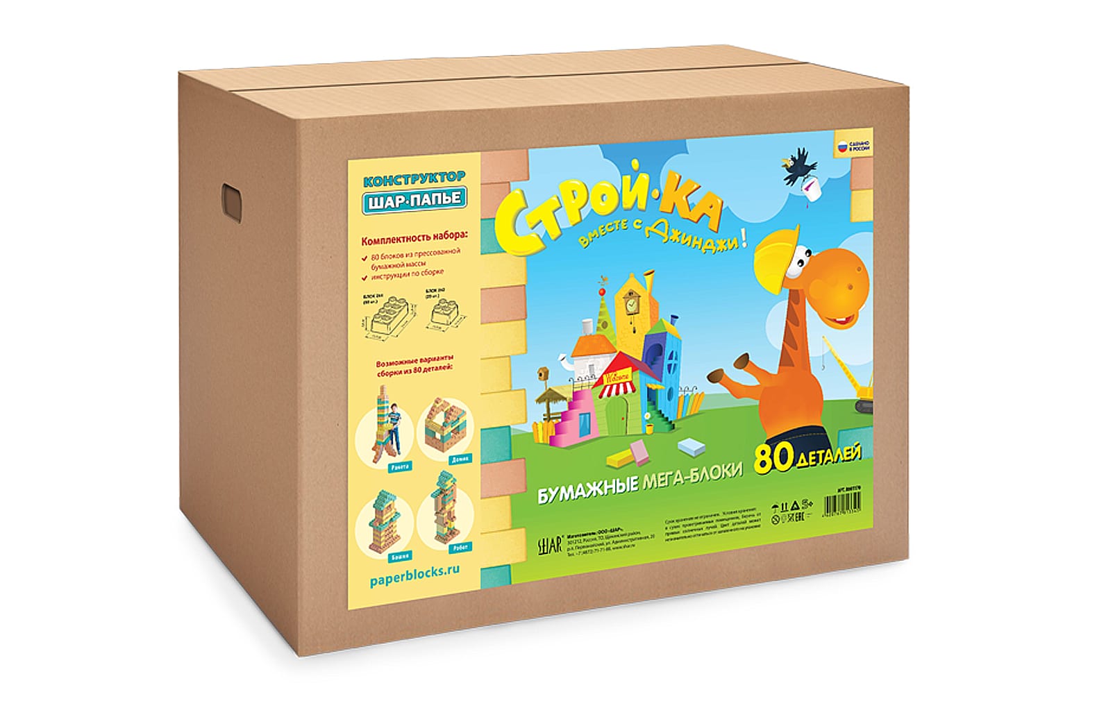 Мега-блоки конструктора ШАР-ПАПЬЕ соединяются по принципу «лего» при этом очень легкие, не имеют острых углов и безопасны для ребенка. Кроме того, на бумажных «кирпичах» можно рисовать красками, фломастерами или аэрозолью. Из 80 деталей набора «Стройка вместе с Джинджи» ребенок самостоятельно может собрать четыре разных объекта. Будет ли лошадка жить в домике или башне, отправится в космическое путешествие на ракете или же обзаведется новым другом — роботом, решать вам.
