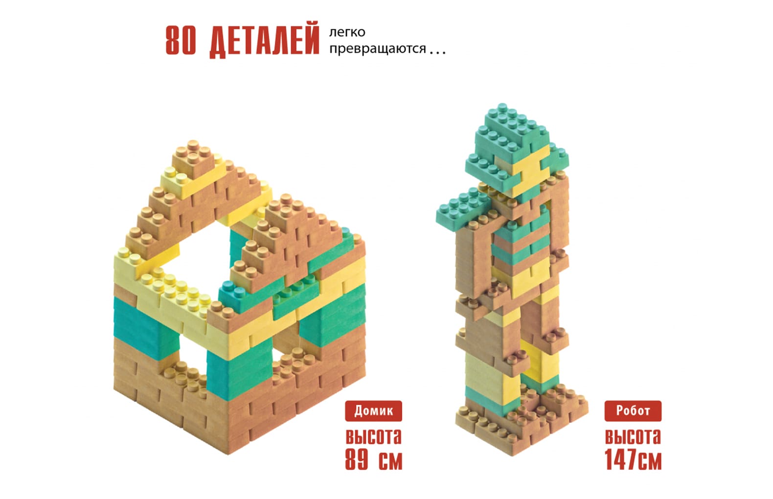 В наборе: 80 блоков из прессованной бумажной массы (60 больших и 20 маленьких) и инструкции по сборке четырех построек (башня, домик, робот и ракета)