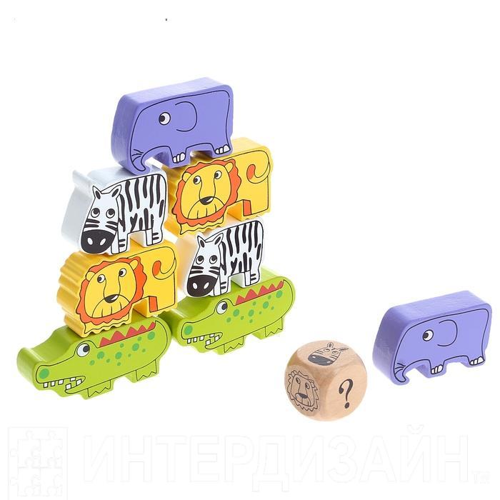 В комплекте идет кубик с изображениями животных. Весь набор выполнен из натурального дерева. По правилам игры игроки делят фигурки между собой и по очереди бросают кубик. Далее выстраивается пирамидка из животных соответствующих выпавшему рисунку.