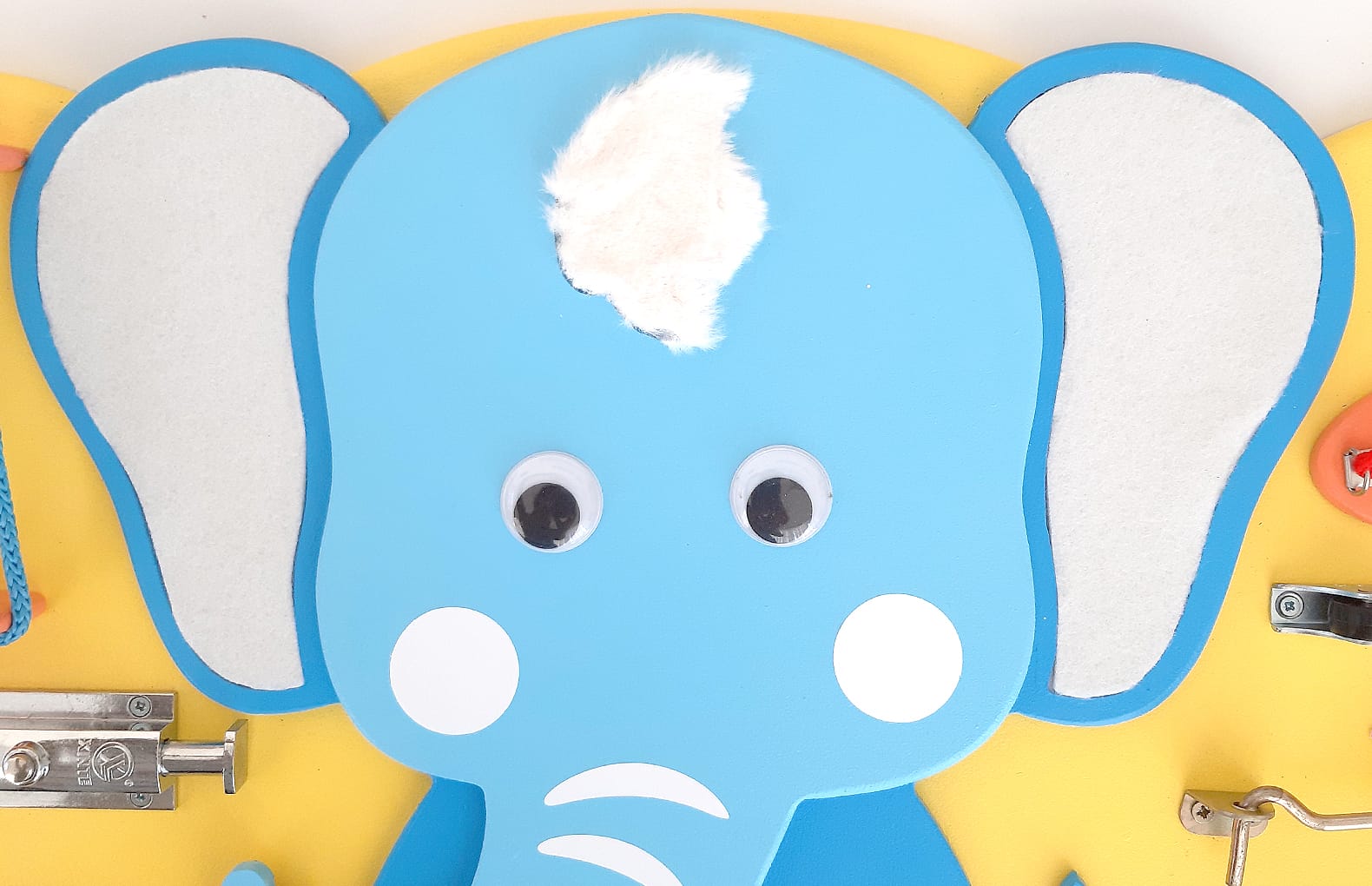 Представляем Вашему вниманию бизиборд "Слоник", разработанный в соответствии с методикой Монтессори.
