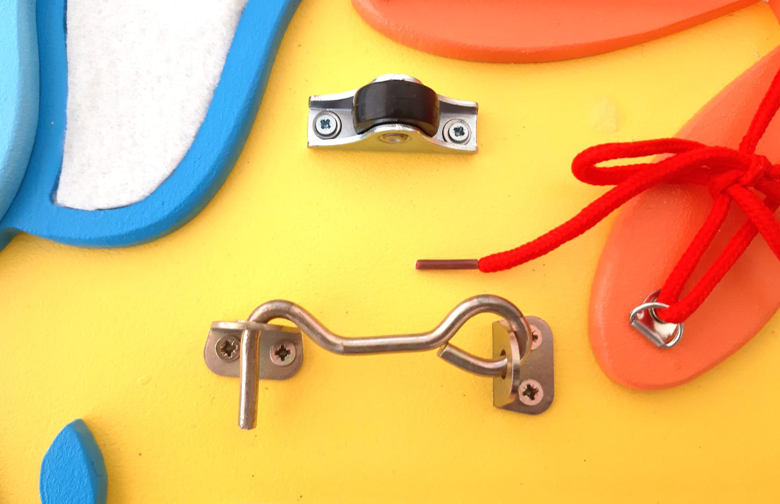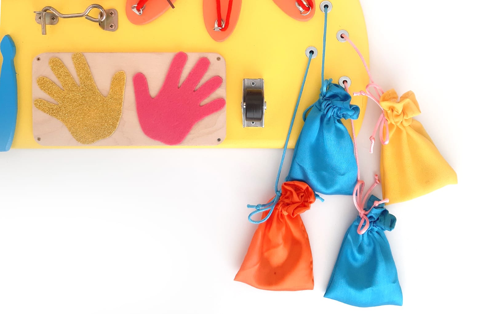 Главная особенность бизиборда - наличие мешочков с завязками, которые Вы можете заполнить любыми тактильными материалами!