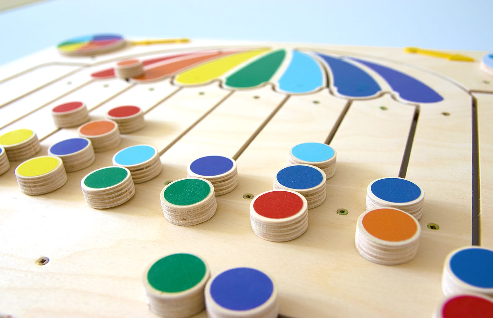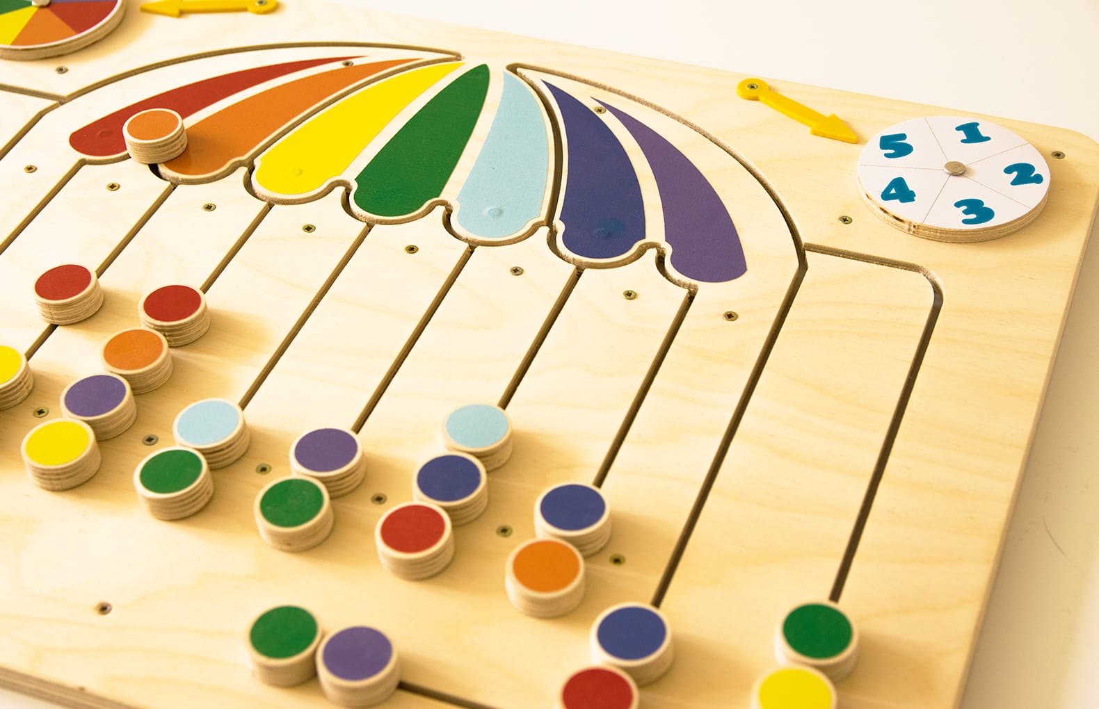 Бизиборд "Веселый зонт" - это отличная игра, развивающая мелкую моторику, счет и логическое мышление. В комплекте есть карточки задания, где ребенок должен повторить заданное расположение цветов. Так же ребенку может помочь с определением рисунка барабаны с цветами и цифрами, где выпадает необходимое количество кружочков определенного цвета, которые нужно разместить в ряд. В игре также есть место для творчества, и ребенок может выстраивать свои рисунки.