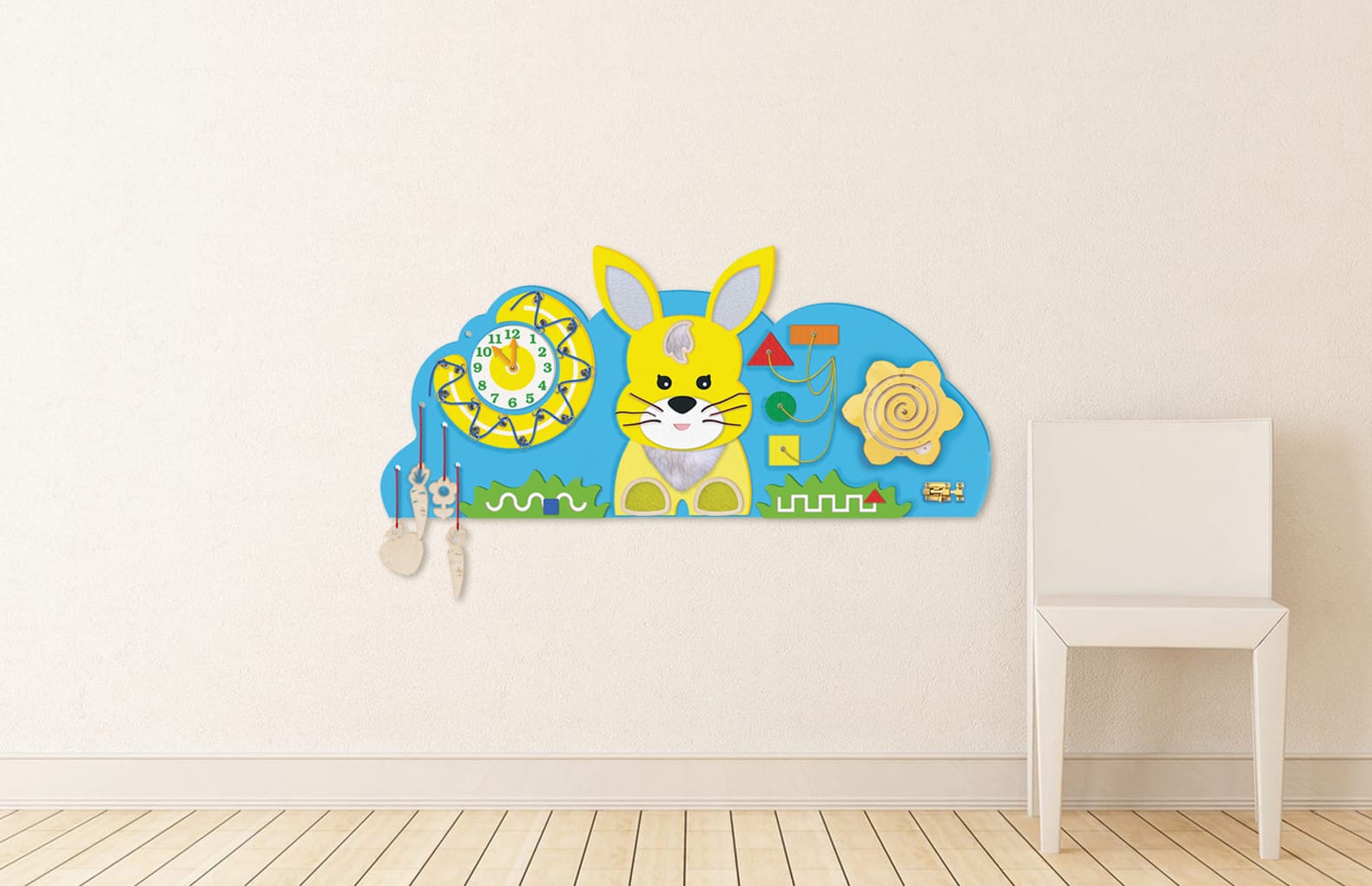 Настенный бизиборд "Зайчик" - это функциональный декор детского интерьера.