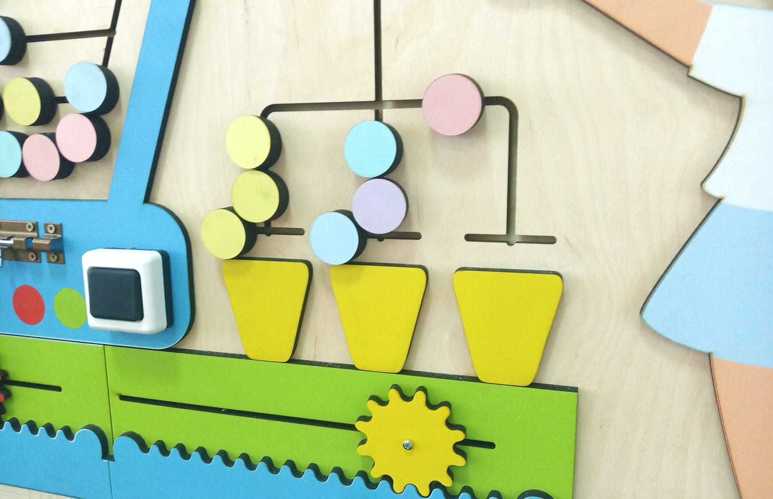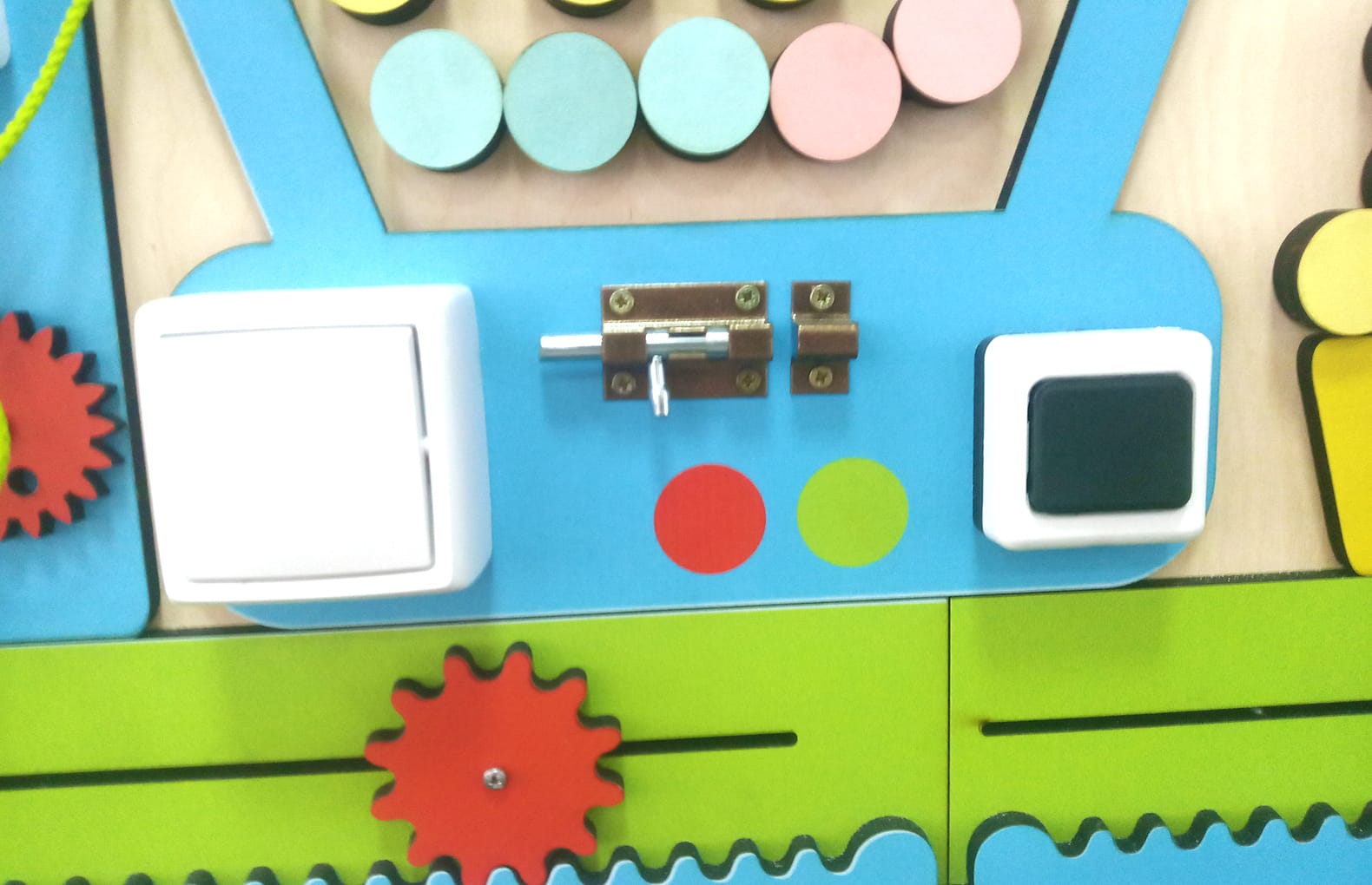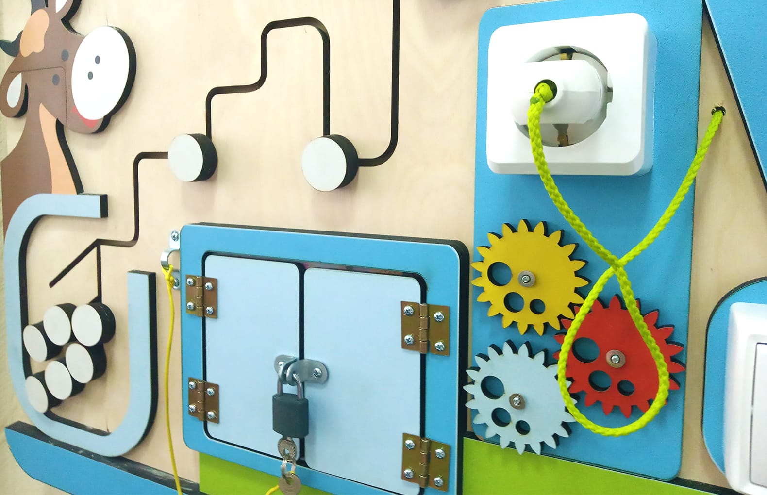 композиция бизибордов создает позитивное настроение. Все элементы размещены на фанерной подложке, за счет этого их хорошо видно и при этом дети не перегружены обилием ярких цветов.