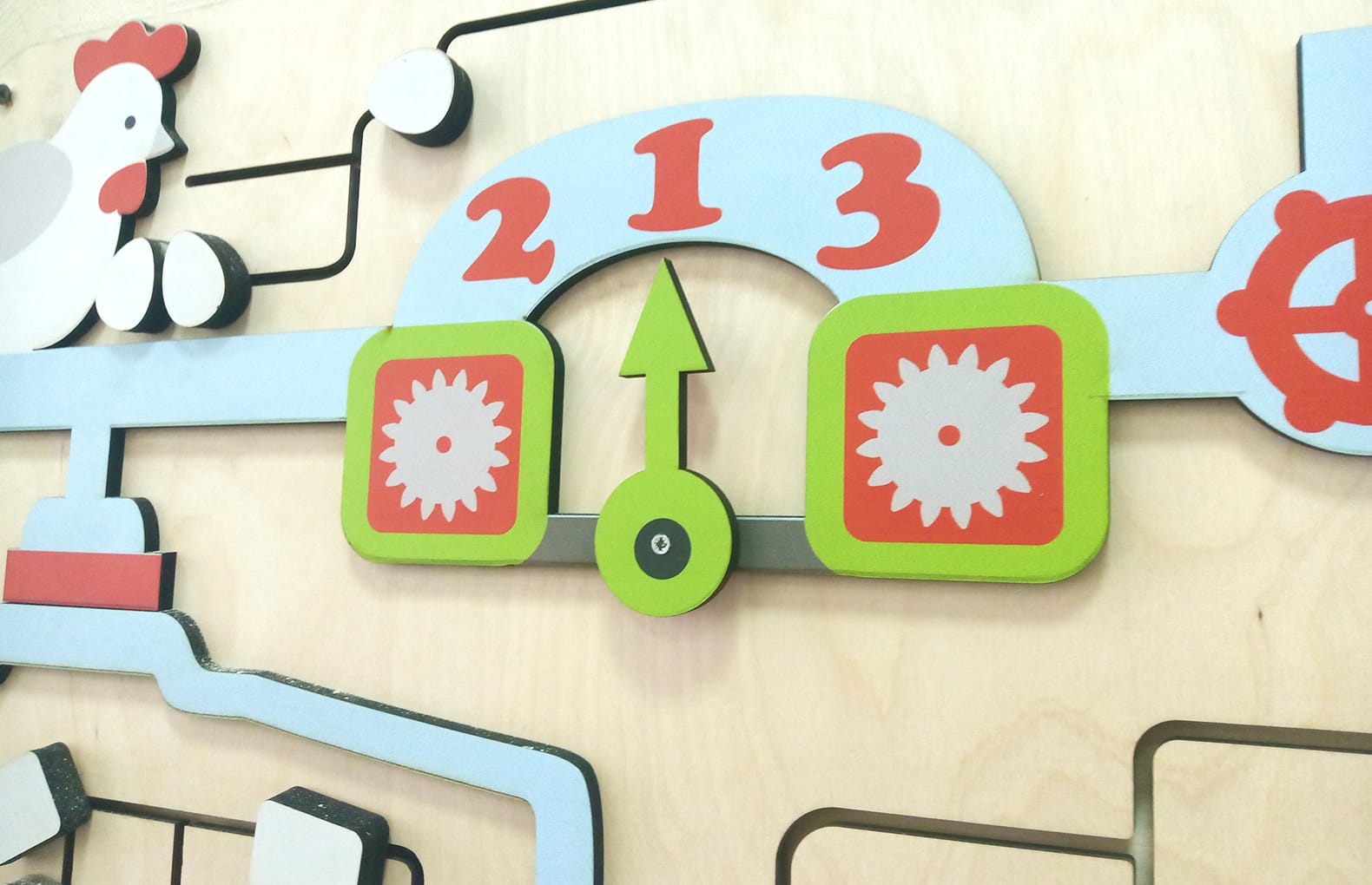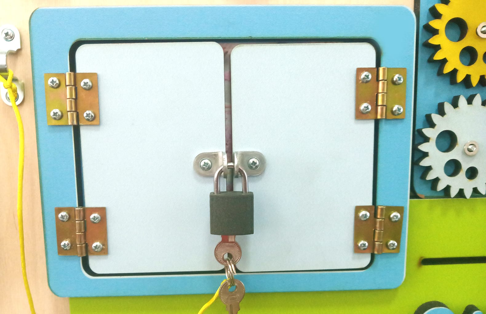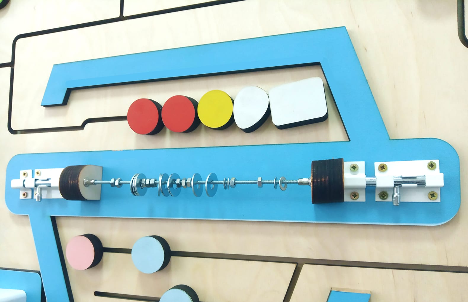 композиция бизибордов создает позитивное настроение. Все элементы размещены на фанерной подложке, за счет этого их хорошо видно и при этом дети не перегружены обилием ярких цветов.