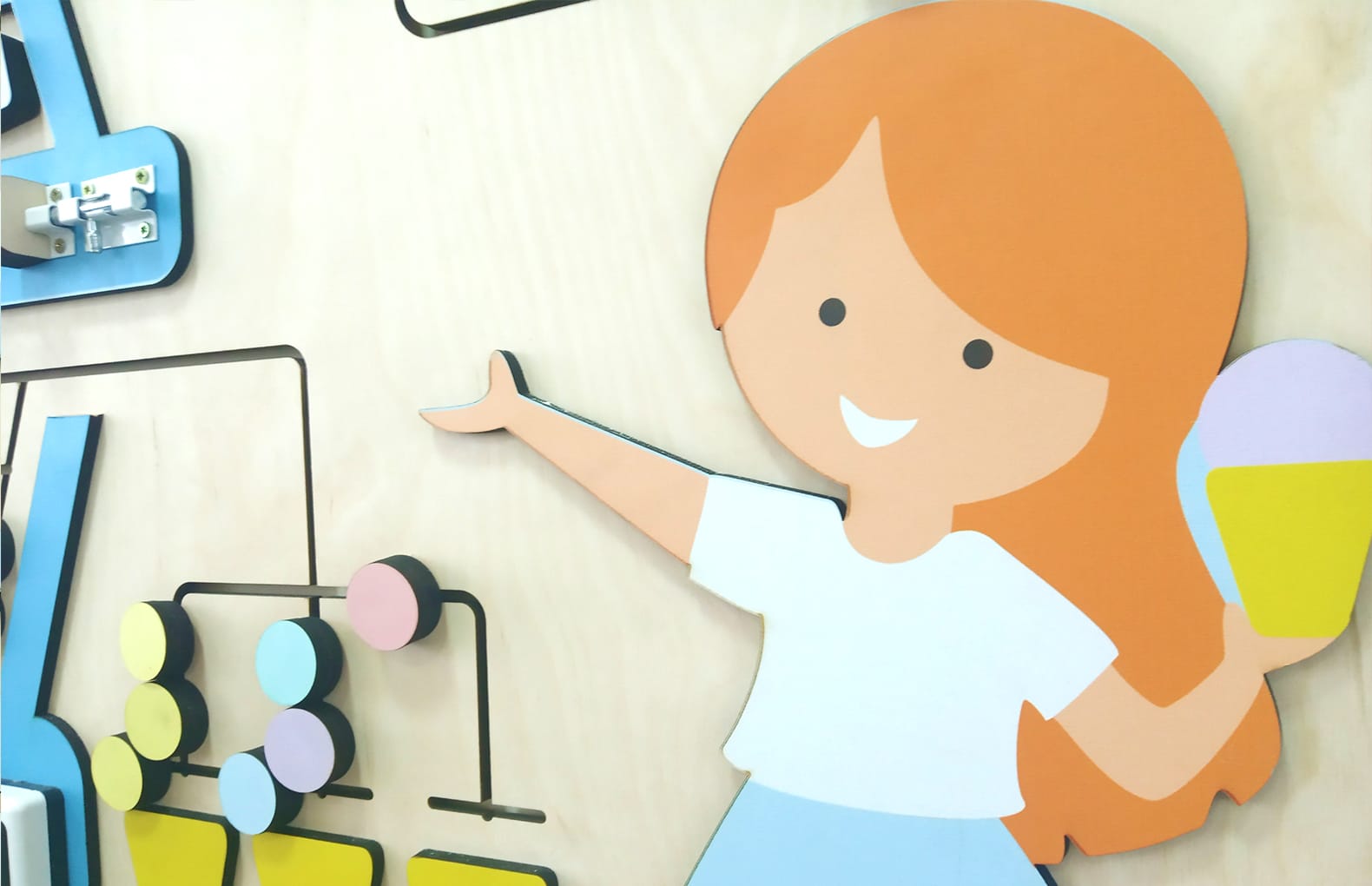Развивает речь, коммуникативные навыки и первичные представления о профессиях. Бизиборд предполагает сюжетную игру в жизнь в роли таких персонажей: производитель мороженого, продавец мороженого и покупатель (или посетитель кафе). Концепция бизиборда дает возможность играть нескольким детям одновременно.