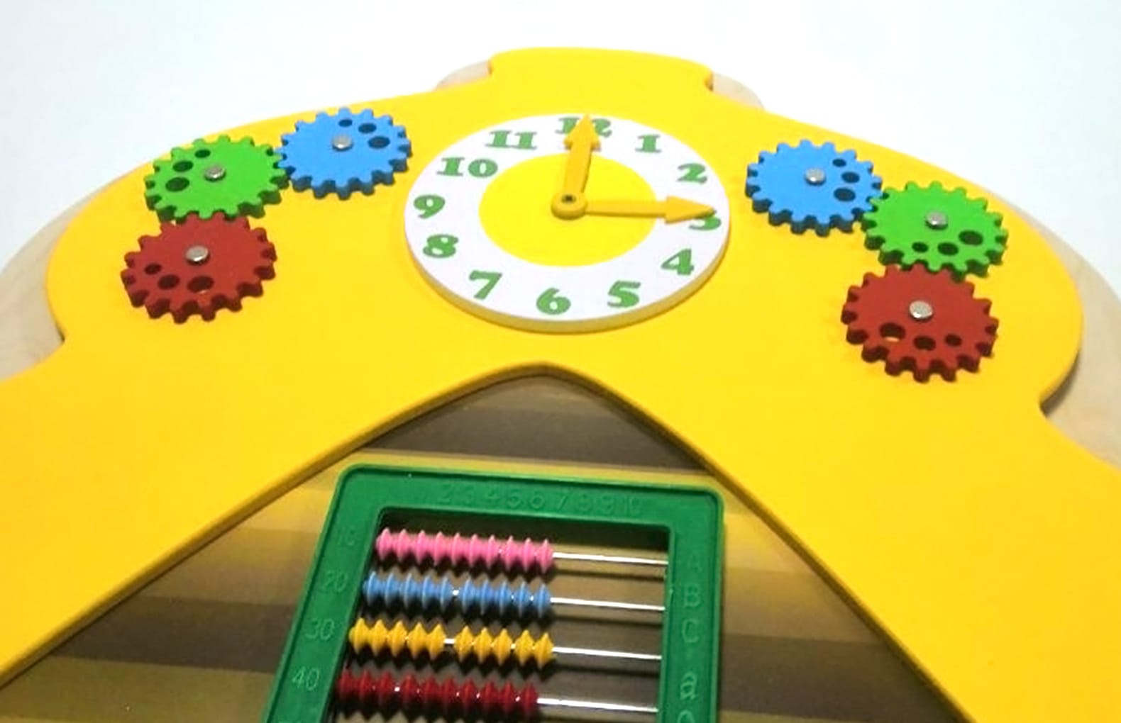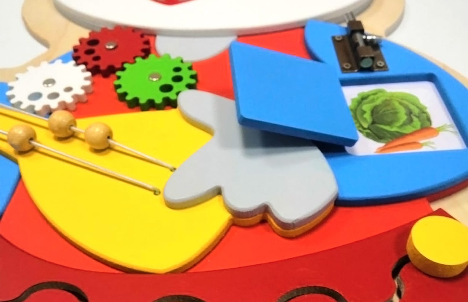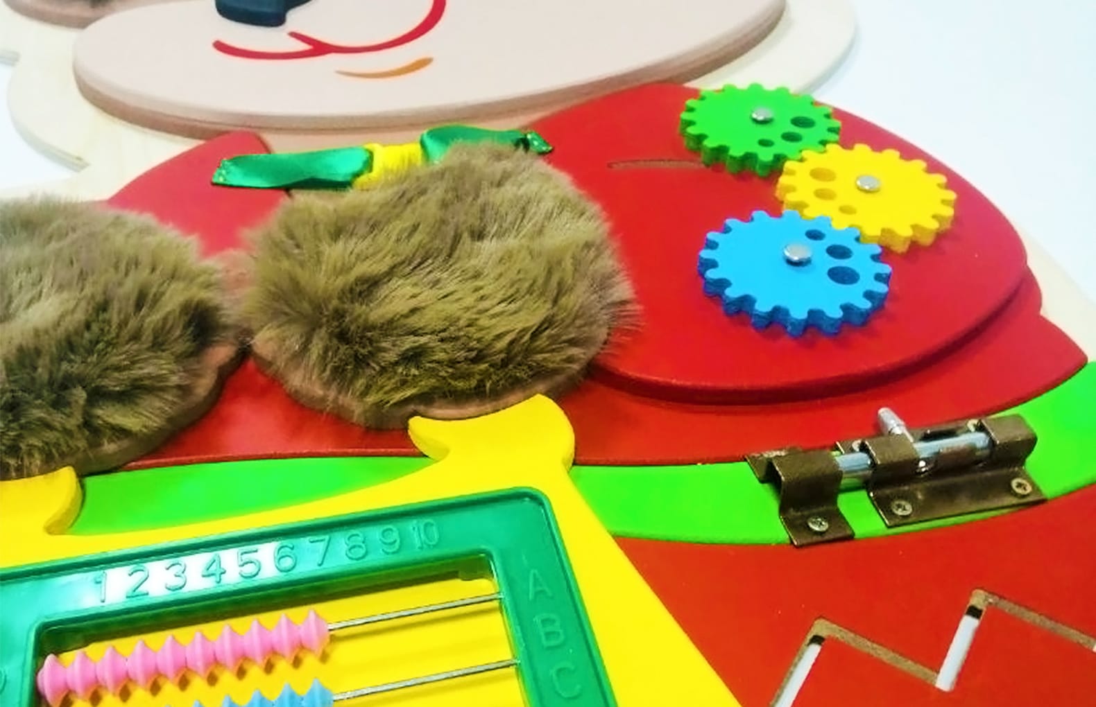 Композиция «Теремок» — это 7 бизибордов, каждый из которых обладает особыми интерактивными элементами.