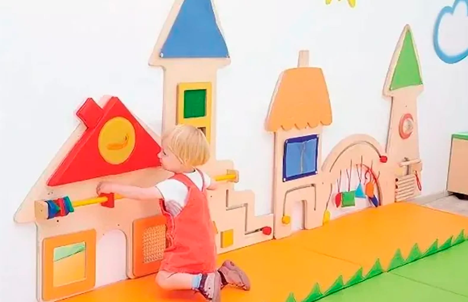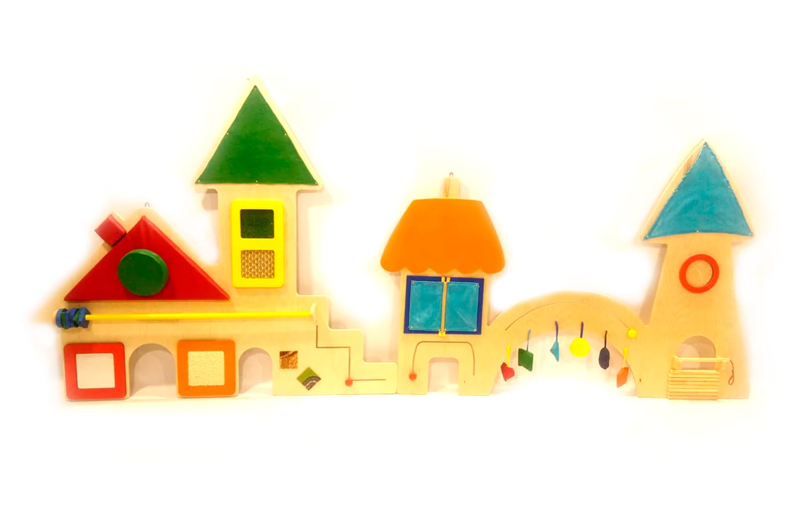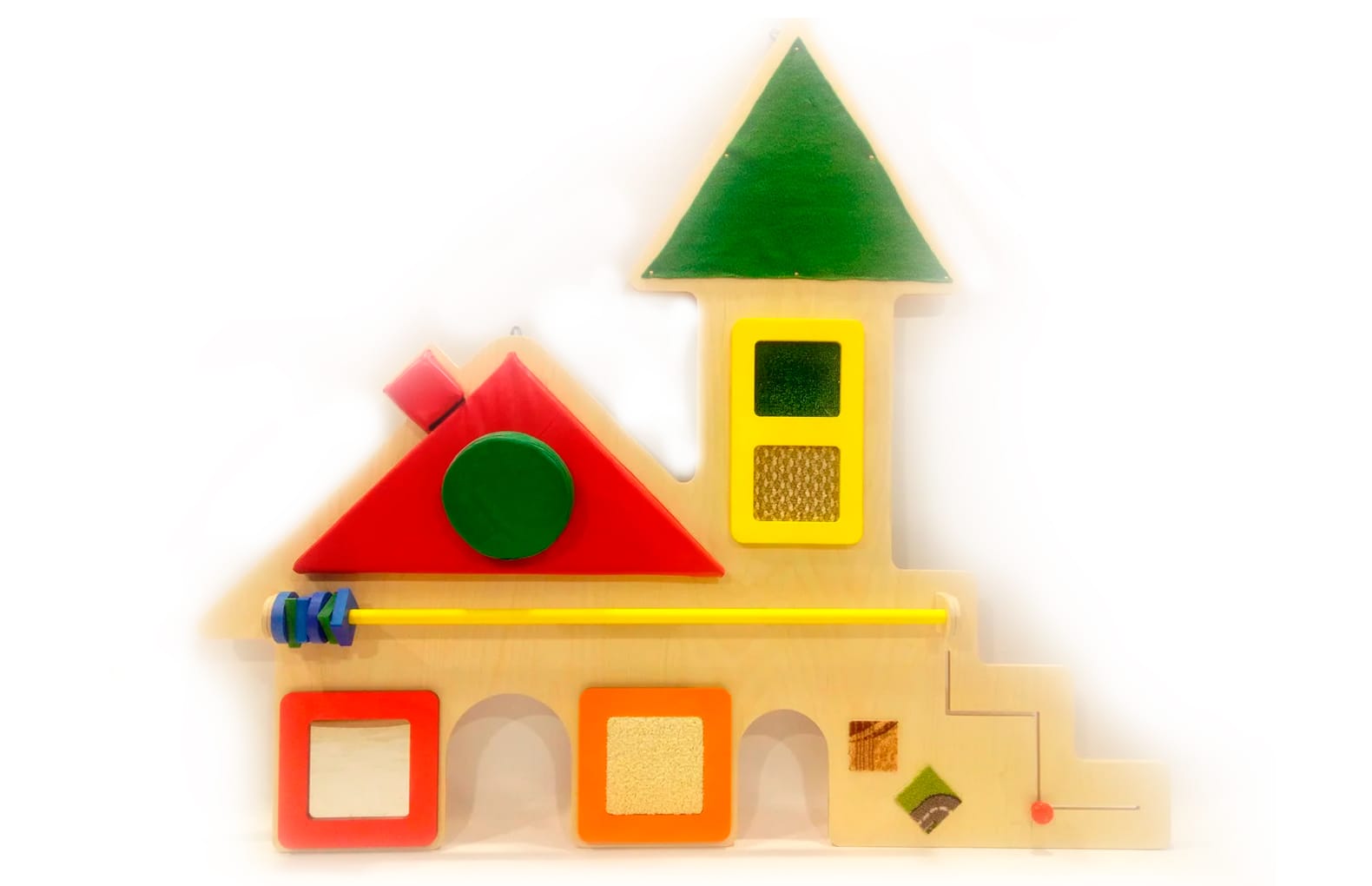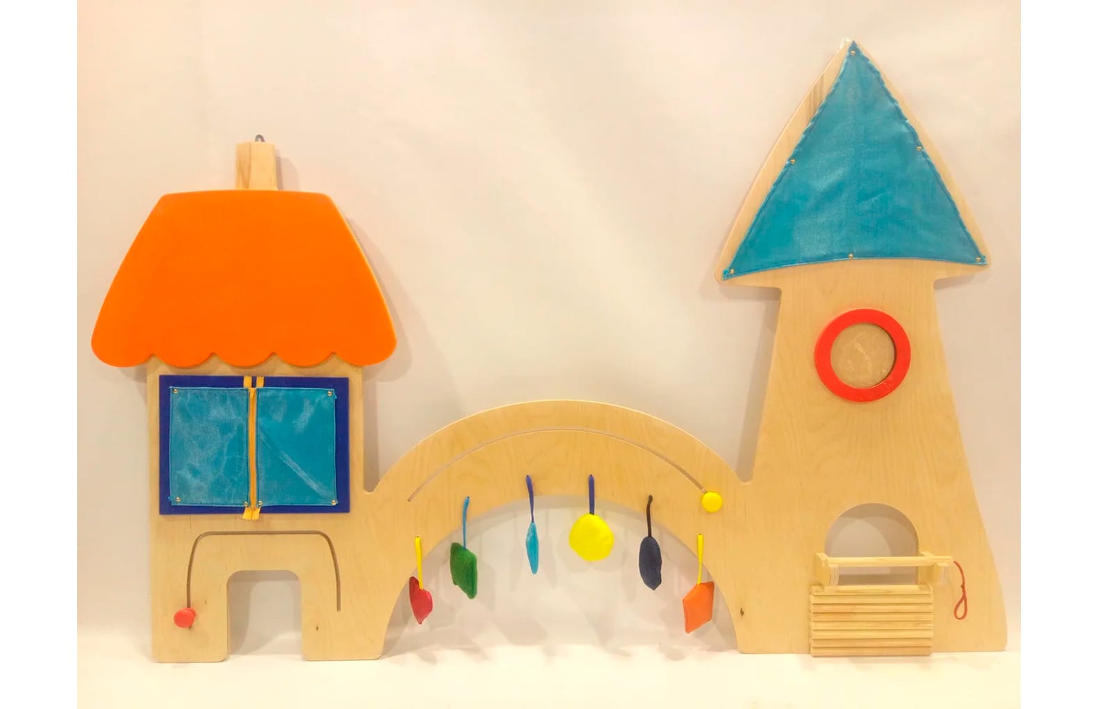 Набор из двух манипулятивных стен, сделаных из фанеры с прикрепленными приложениями из хлопка. Предназначен для развития ловкости рук детей и их двигательной и зрительной координации, развитие тактильных ощущений, изучение геометрических фигур и цветов.
