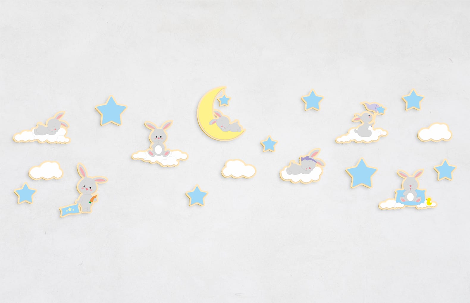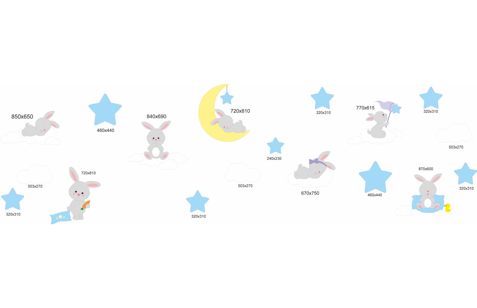 В комплекте: Декорации Зайчики 7 шт.: 85х65см, 72х81см, 84х69см, 72х81см, 67х75см, 77х61см, 87х60см, Декорации Тучки 3 шт.: 50х27см, Декорации Звезды 8 шт.: 46х44см- 2 шт., 32х31см- 5 шт., 24х23см- 1 шт.