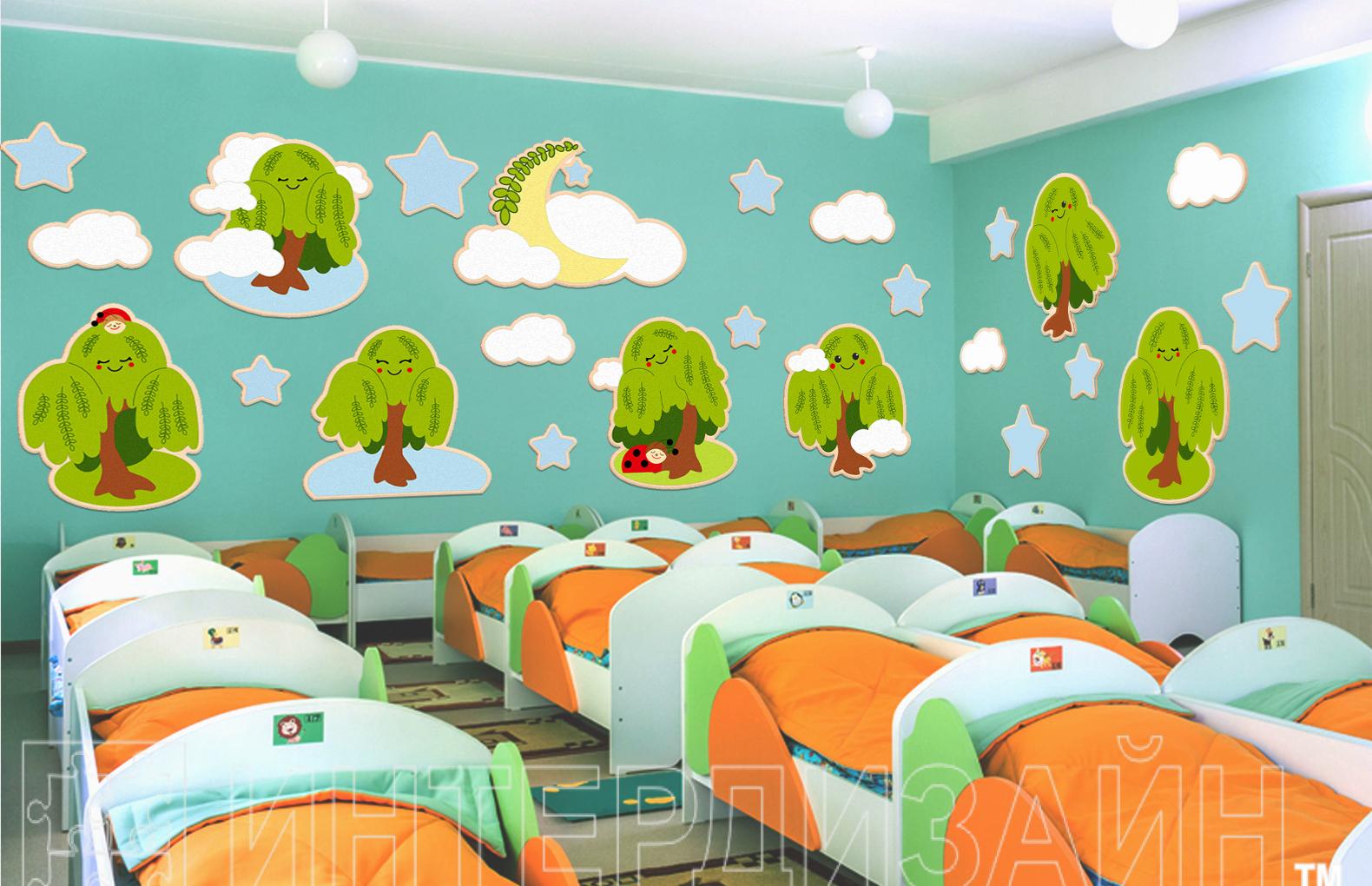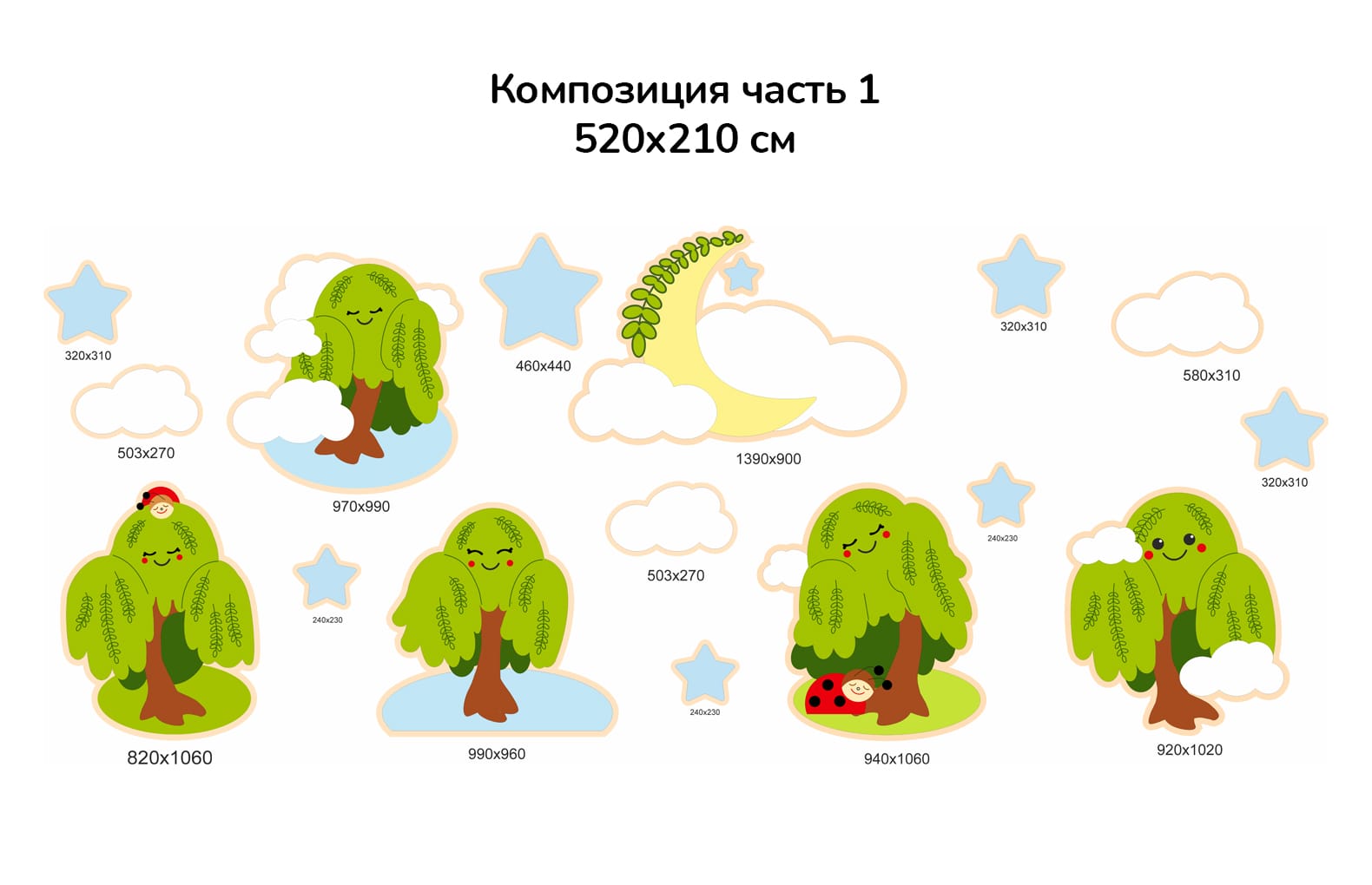 Ивушки: 82х106см, 97х99см, 99х96см, 94х106см, 92х102см, 95х105см, 94х114см, Звездочки: 32х31см (5шт.), 24х23см (3шт.), 46х44см (3шт.), Тучки: 50х27см (3шт.), 58х31см (2шт.), Луна в тучках 139х90 см