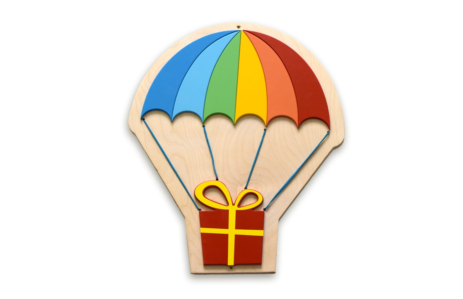 Декорация "Парашют с подарком" хорошо подходит для оформления раздевалок, коридоров и детских садов, а также для залов ожидания и кабинетов врачей, или детских комнат.