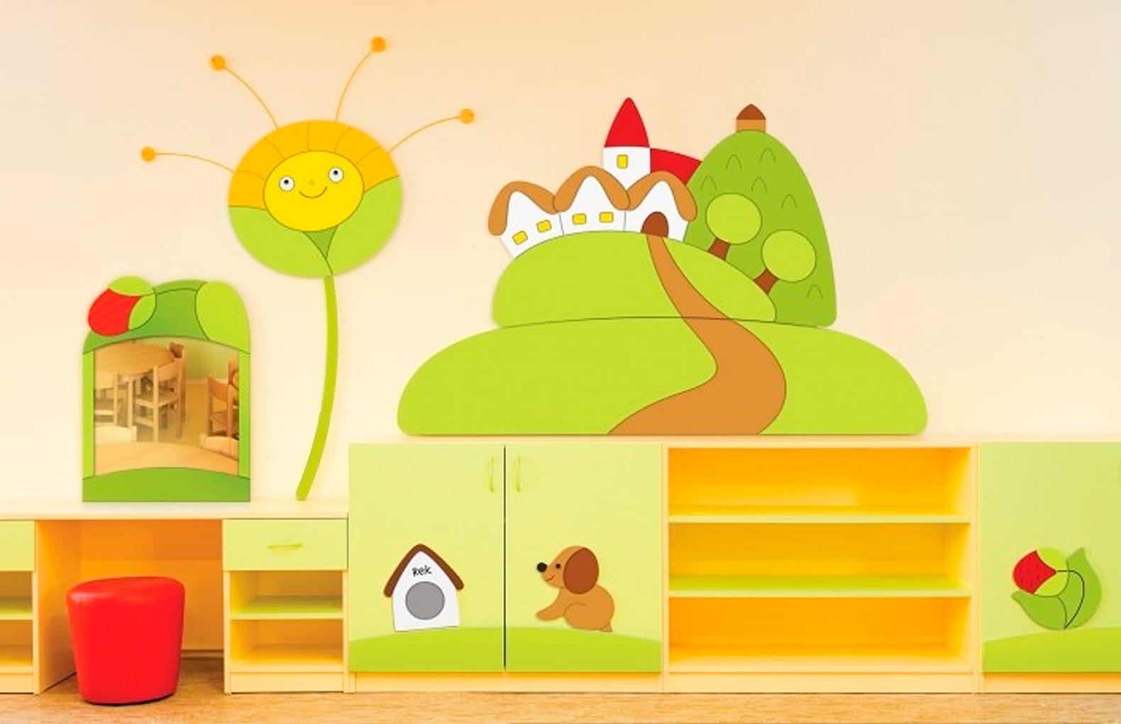 Отделка стен с детским мотивом, подходящая для раздевалок, коридоров и детских садов, а также для залов ожидания и кабинетов врачей или для детских комнат.