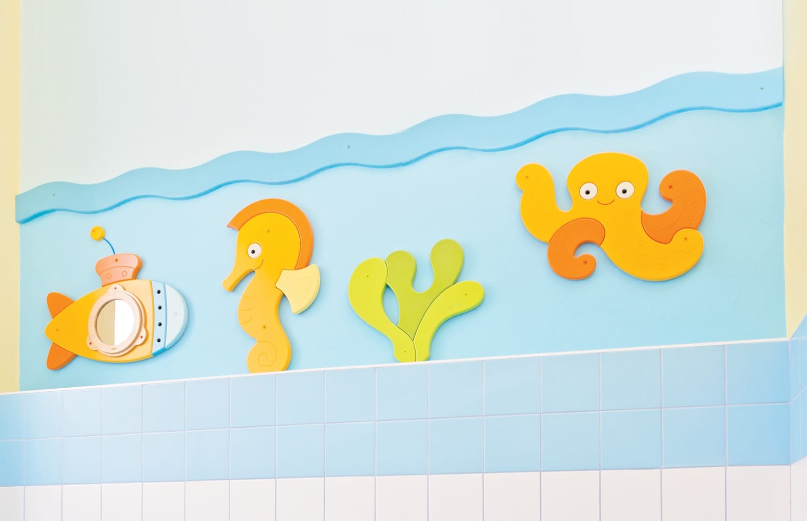 Декорация "На рифе" отлично подойдет для декорирования раздевалок, коридоров и детских садов, а также для залов ожидания и кабинетов врачей или для детских комнат в морской тематике.