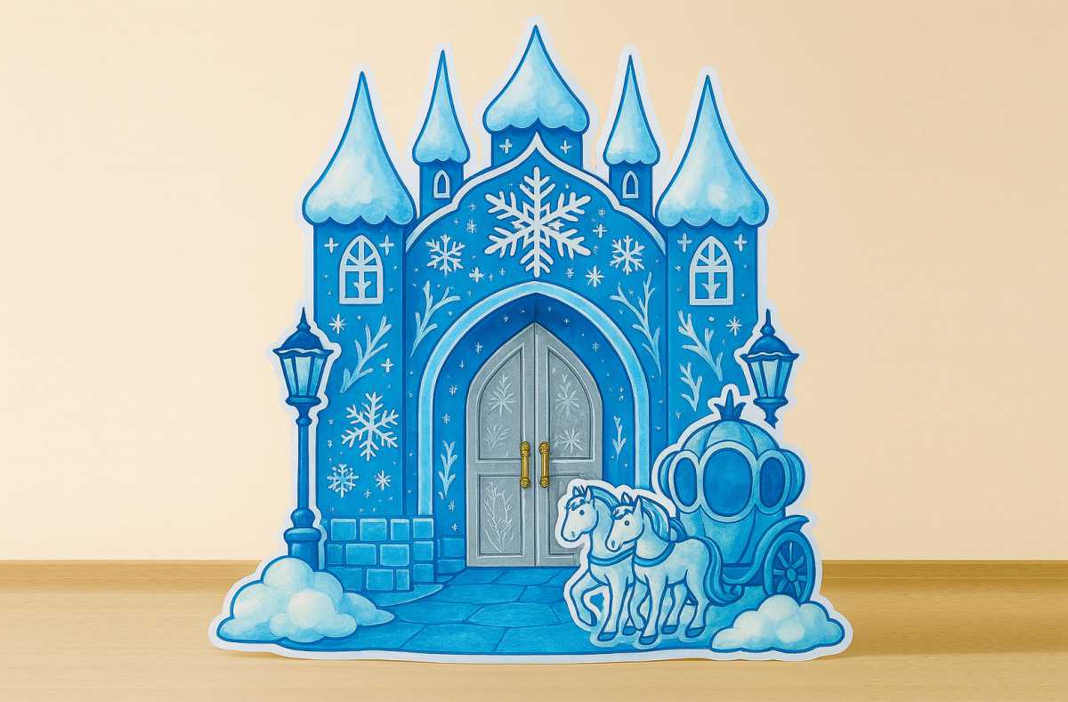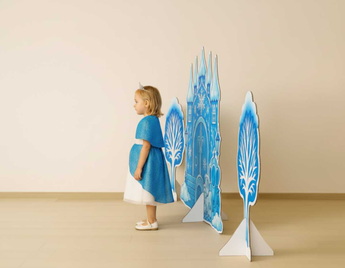 Войдите в мир волшебства с нашим полным набором декораций «Сказка Ледяной принцессы»! Создайте на своей сцене настоящее ледяное царство, где величественный дворец сверкает в окружении таинственного заснеженного леса из двух сказочных деревьев.