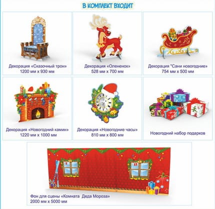 В комплекте :Декорация "Сказочный трон" 1200 мм * 930 мм Декорация "Олененок" 528 мм * 700 мм Декорация "Сани новогодние " 754 мм * 500 мм Декорация "Новогодний камин" 1220 мм * 1000 мм Декорация "Новогодние часы" 810 мм * 800 мм Новогодний набор подарков Фон для сцены "Комната Деда Мороза" 2000 мм * 5000 мм