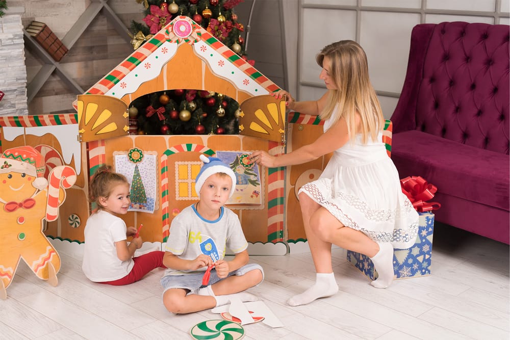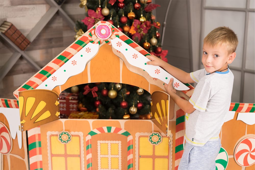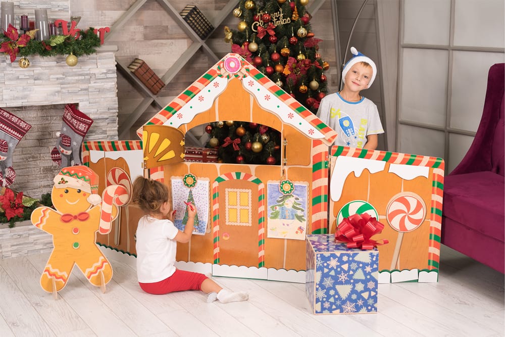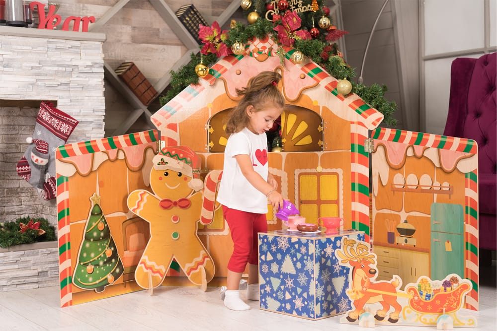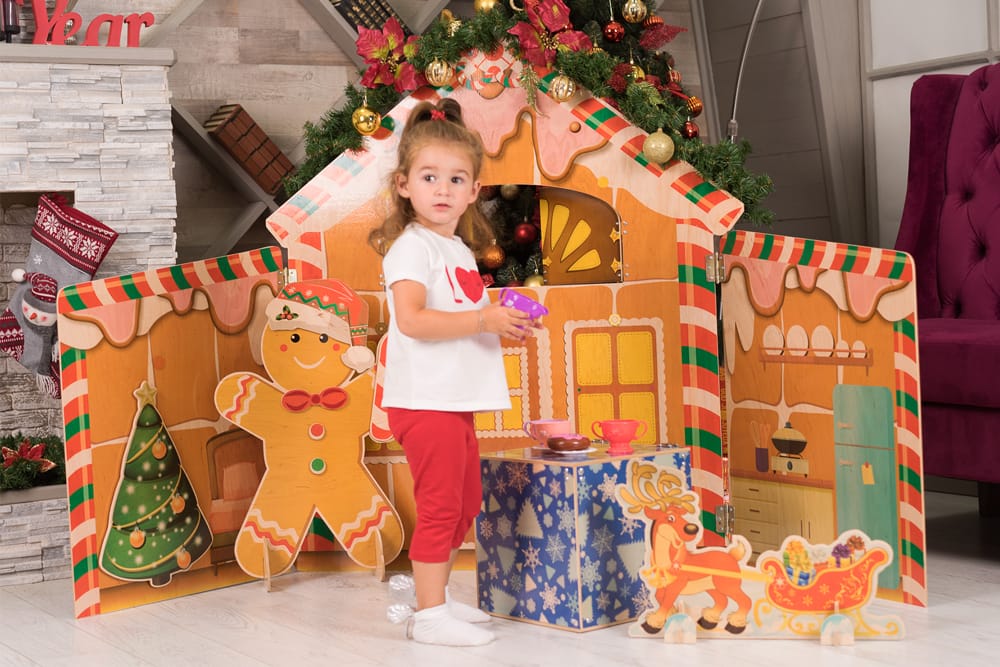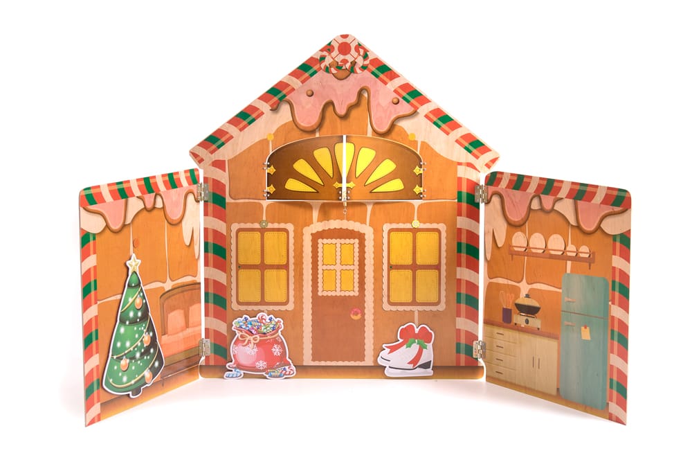 Домик можно использовать как декорацию для детских праздников, как Рождественскую фотозону, а также задействовать в ролевых играх. Благодаря открывающимся створкам домик можно использовать как магазин, кафе, гостиницу, приглашать в домик гостей, а также превращать его в ширму для кукольного театра!