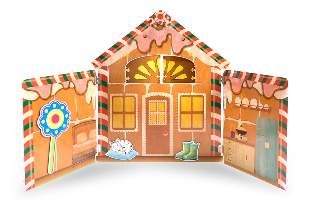 Домик пряничного человечка двухсторонний: одна сторона - внешняя часть дома, вторая - внутренняя. Кроме того, благодаря магнитным съемным элементам домик легко трансформируется из летнего в зимний и наоборот.