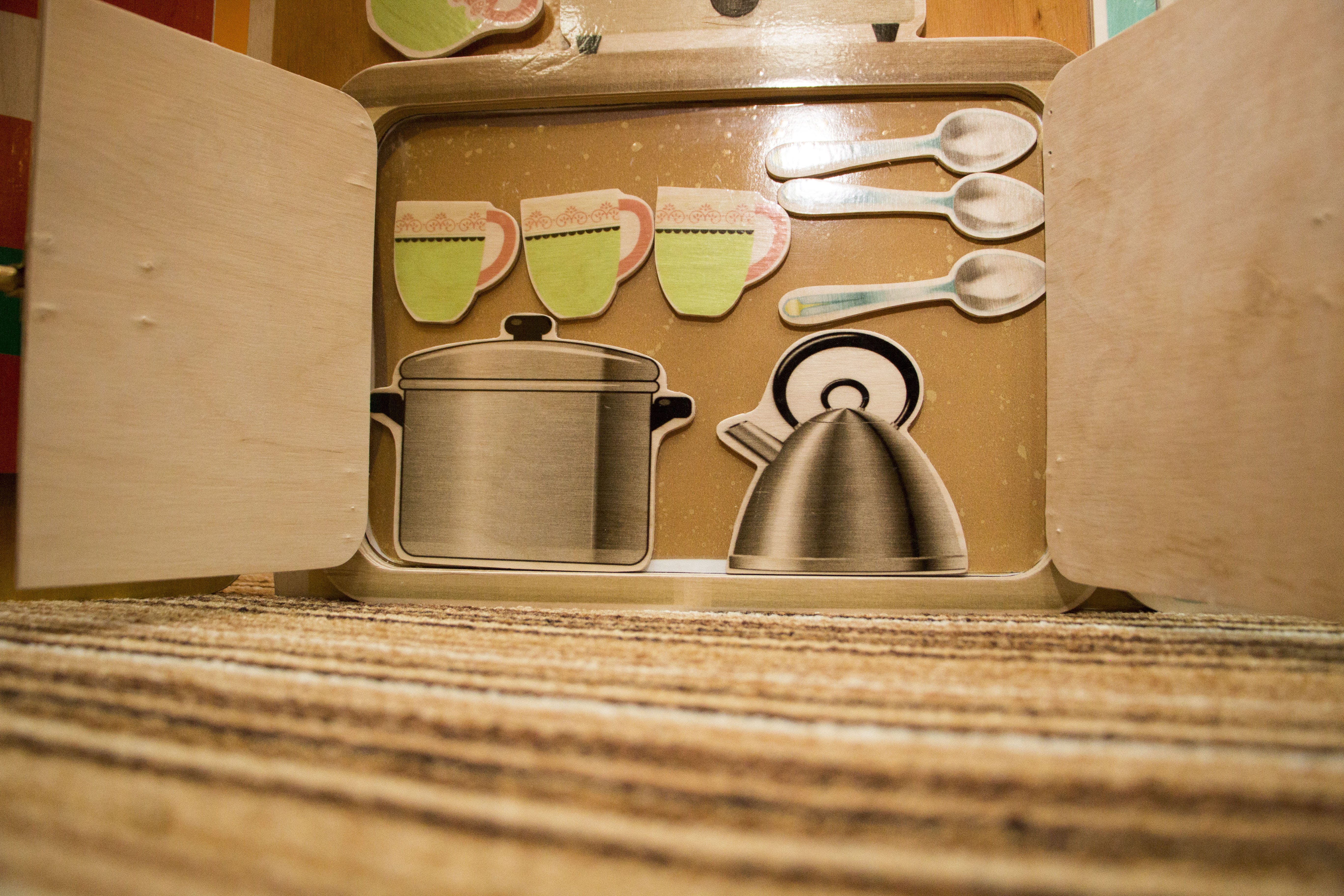 В комплекте Домик трехстворчатый, комплект магнитных элементов для смены сезонов, комплект магнитных элементов для игры (посуда на магнитах, продукты питания на магнитах, предметы интерьера)