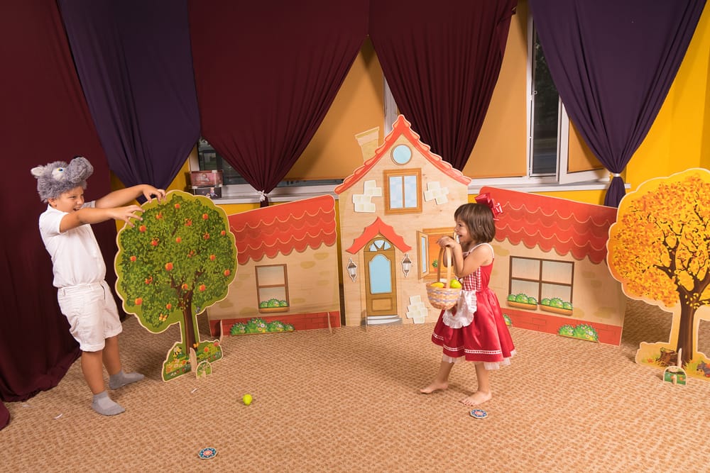 В некоторых спектаклях дети могут имитировать строительство дома (строить его внешнюю часть, прикрепляя детали) .