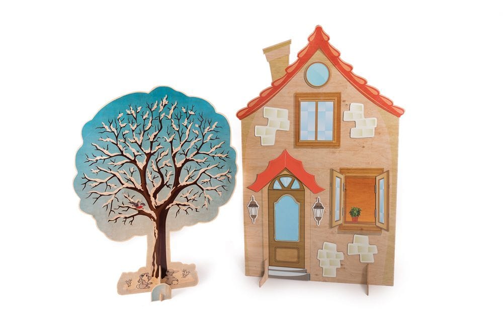 В комплекте:многофункциональный дом двухсторонний, 54 съемных элемента с ферритовым магнитом (для смены сезонов и деталей интерьера), дерево двустороннее Весна-Лето, дерево двустороннее Осень-Зима