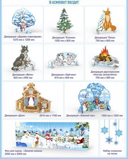 В комплекте Декорация «Дерево новогоднее»( 1270 ммx1250 мм) Декорация «Елочка»( 1200 мм x 900 мм) Декорация «Лиса» ( 750 мм x 800 мм) Декорация «Волк» (820 мм x 800 мм) Декорация «Зайчики» (915 мм x 400 мм) Декорация двусторонняя «Костер (зима/лето)» ( 700 мм x 560 мм) Декорация «Дом»(2910 мм x 1795 мм) Декорация «Зимний лес» (1500 мм x1200 мм) Фон для сцены «зимняя сказка» (2000 мм x 5000 мм) Набор снежинок на леске 25 шт (100 мм x 100 мм)